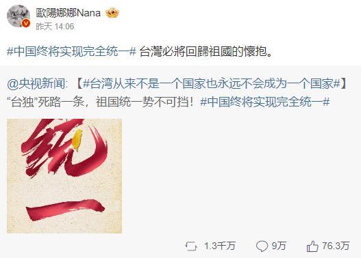 欧阳娜娜也被网友称赞“在祖国统一的问题上,一直很佩服娜娜的勇气,请各位中国台湾艺人比照办理!”“喜欢娜娜直截了当,不两面三刀”。