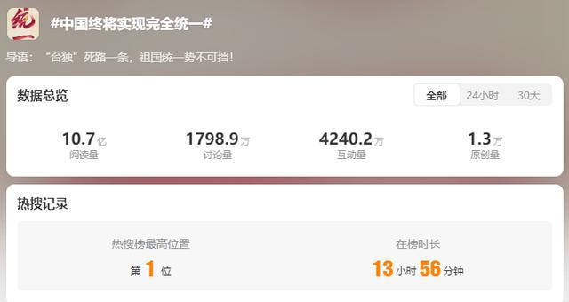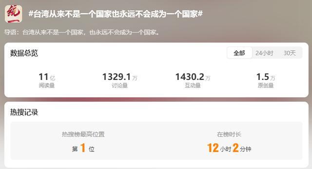 在台湾地区领导人赖清德“5·20”讲话发表“台独”言论后,5月22日,@央视新闻 官方微博发布帖文,内容提到“‘台独’死路一条,祖国统一势不可挡!”,相关话题#台湾从来不是一个国家也永远不会成为一个国家#、#中国终将实现完全统一#先后登上微博热搜第一。