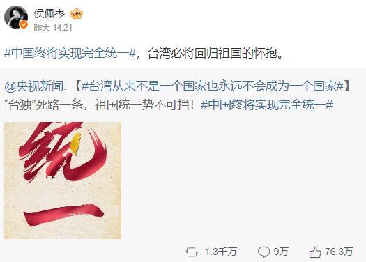 报道称,大陆网友在侯佩岑微博下方留言赞扬“好棒,佩岑姐姐勇敢表明立场”“姐姐从始至终思想统一,我们爱的优秀的姐姐”“给侯主播点赞,不愧是我喜欢了20年的女人”。