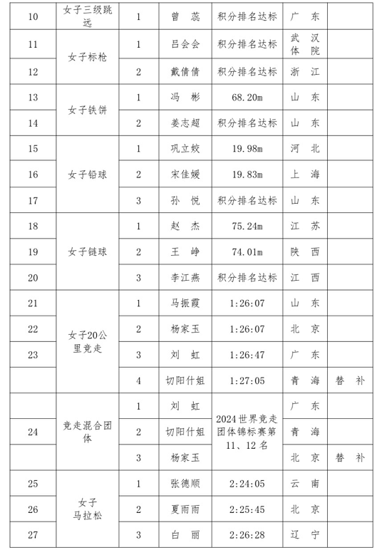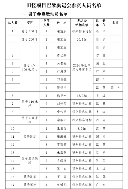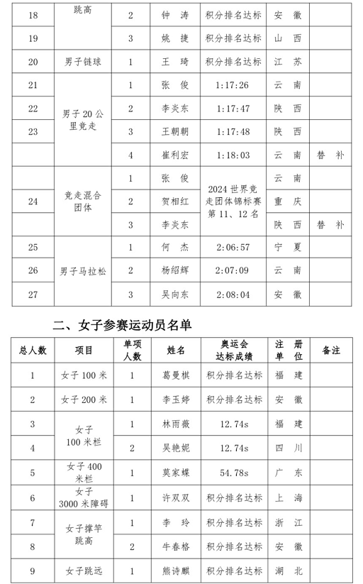 中国田径队巴黎奥运会名单: