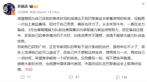 其称,很遗憾因为自己目前的身体状况和成绩达不到巴黎奥运会参赛资格的标准,没能再一次站上奥运赛场,但对于自己而言,确实也尽力了。从去年到今年,一直在全力备战,3月也曾跟随接力队前往美国集训为争取接力奥运资格努力,但在备战过程中,发现自己的身体情况仍不太好,训练效果并不理想,成绩不能够为接力队创造优势。