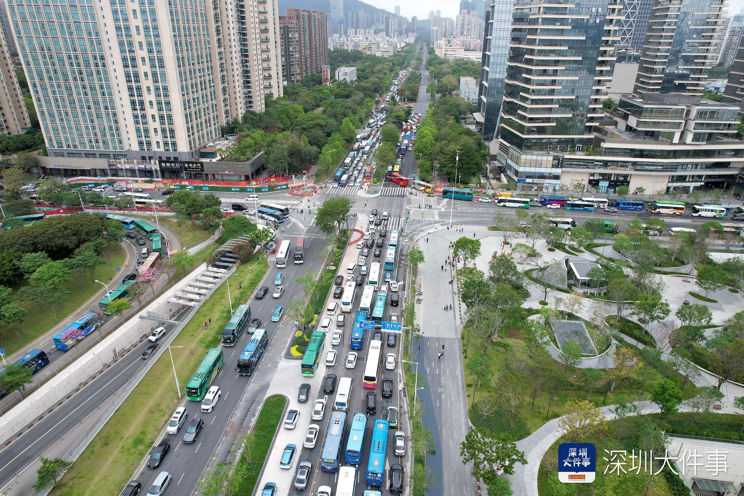 4月18日上午,东滨路上等待进入口岸的车流。交警部门常态化在深圳湾口岸周边设置12个警力值守岗,负责引导交通流及疏导节点拥堵,节假日期间视情况启动保障方案,额外增派4个值守岗,安排备勤警力支援。