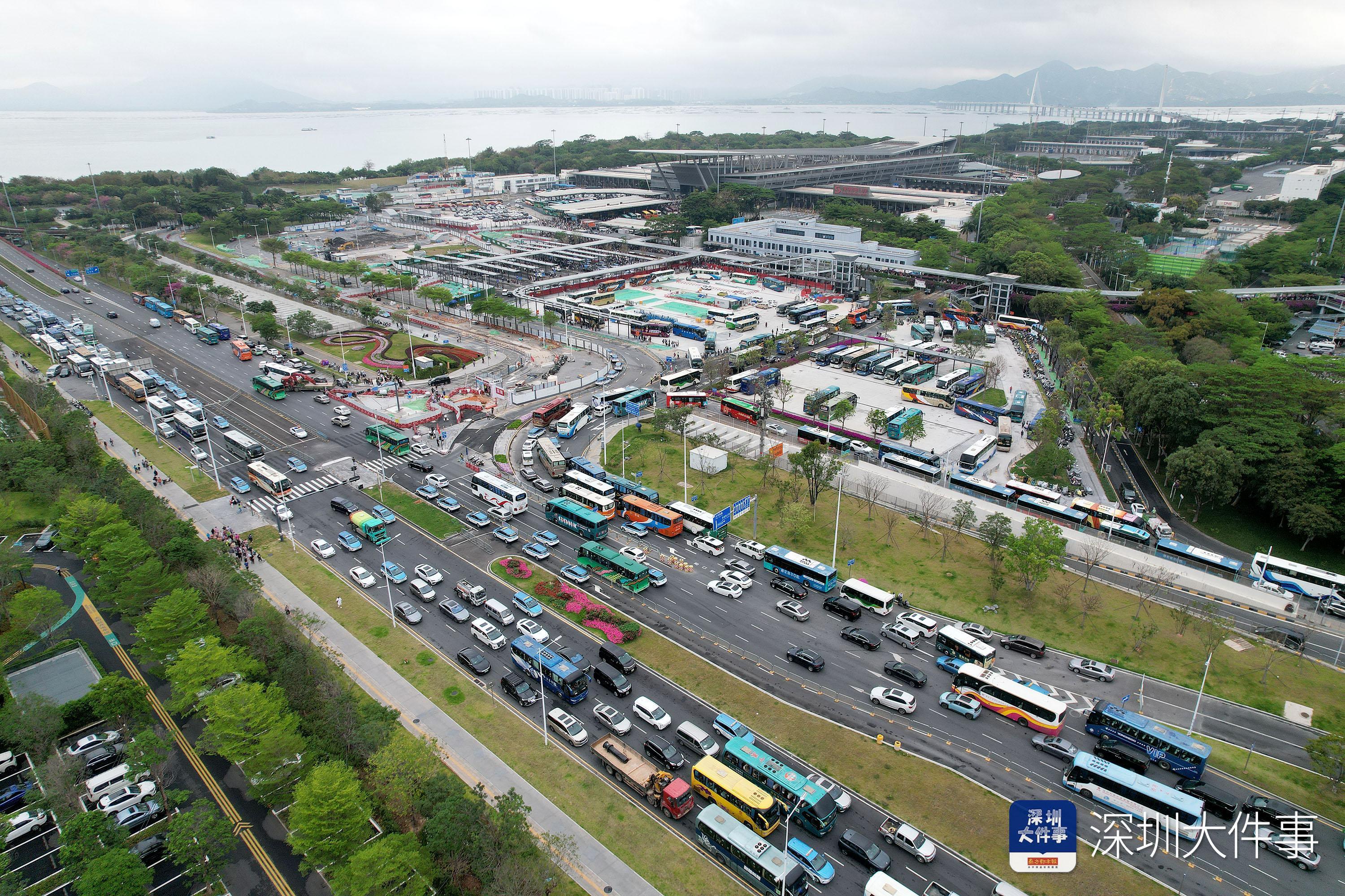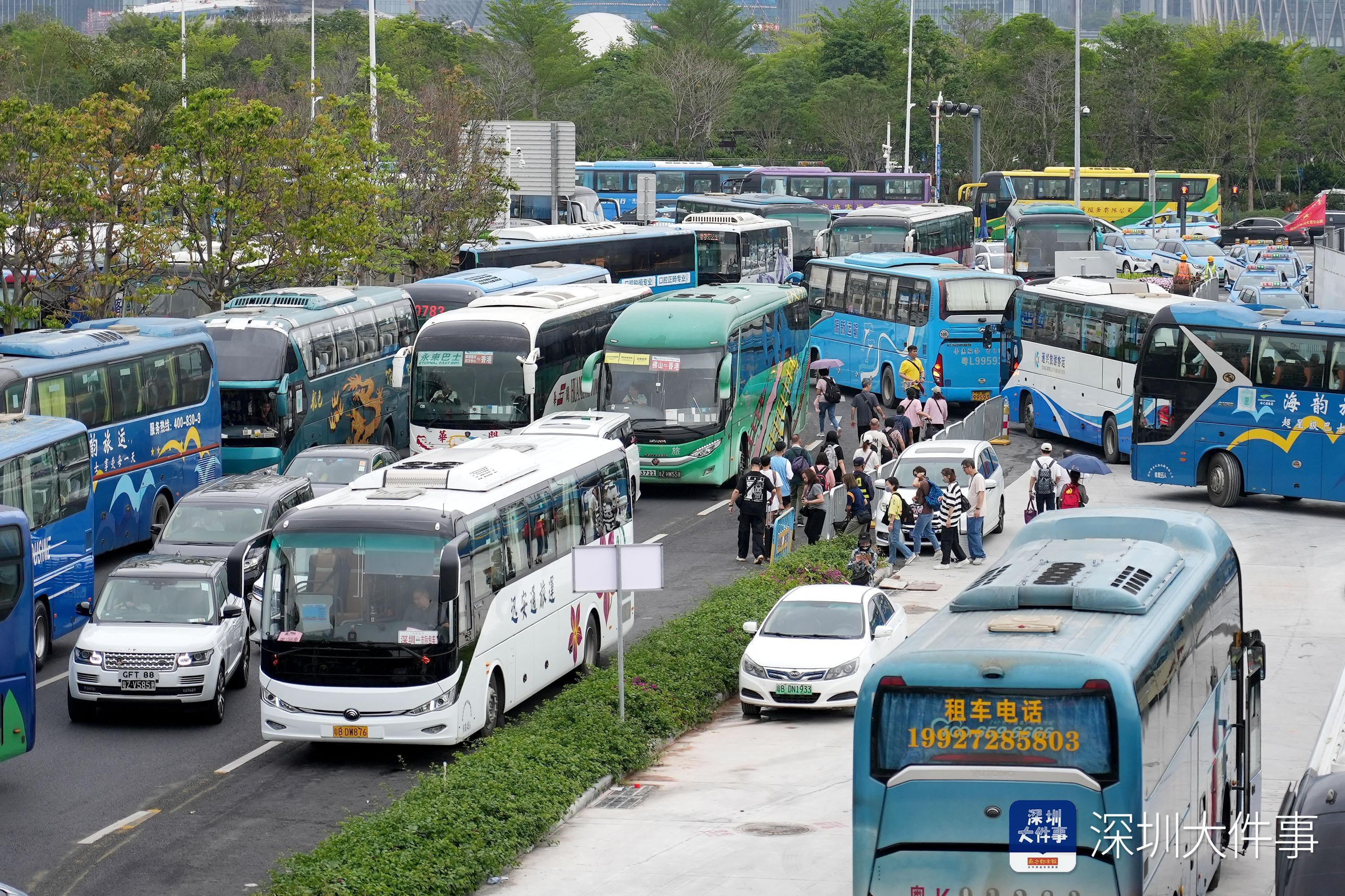 4月18日上午,深圳湾口岸的旅游巴士。目前驾车进入深圳湾口岸,需要绕行至东滨路由西往东方向,右转进入。4月18日(港人复活节假期)上午十点半,南都记者在东滨路看到,由沙河西路、望海路驶入口岸方向的车辆,要先在东滨路由东往西行驶,东滨路靠近科苑南路处专门给出租车设置了一处掉头口,其他车辆则都要在东滨路靠近中心路的路口掉头,切换为由西往东方向,因此该掉头路口也成为了堵点,大量车辆在排队等候掉头。而由东滨路的西边直接由西往东行驶的车辆,车流也排到了东滨路和后海滨路交会的路口。