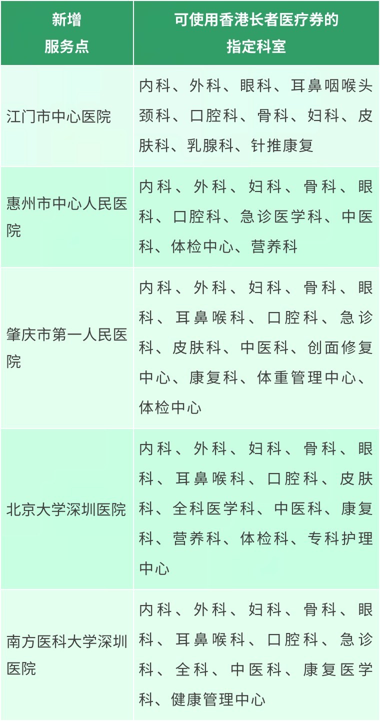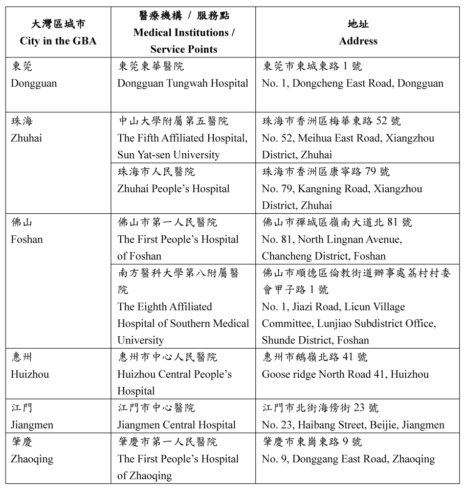 新纳入试点计划的五间医疗机构中,江门市中心医院和惠州市中心人民医院将在8月21日起提供服务;而肇庆市第一人民医院、北京大学深圳医院和南方医科大学深圳医院则8月28日起提供服务。