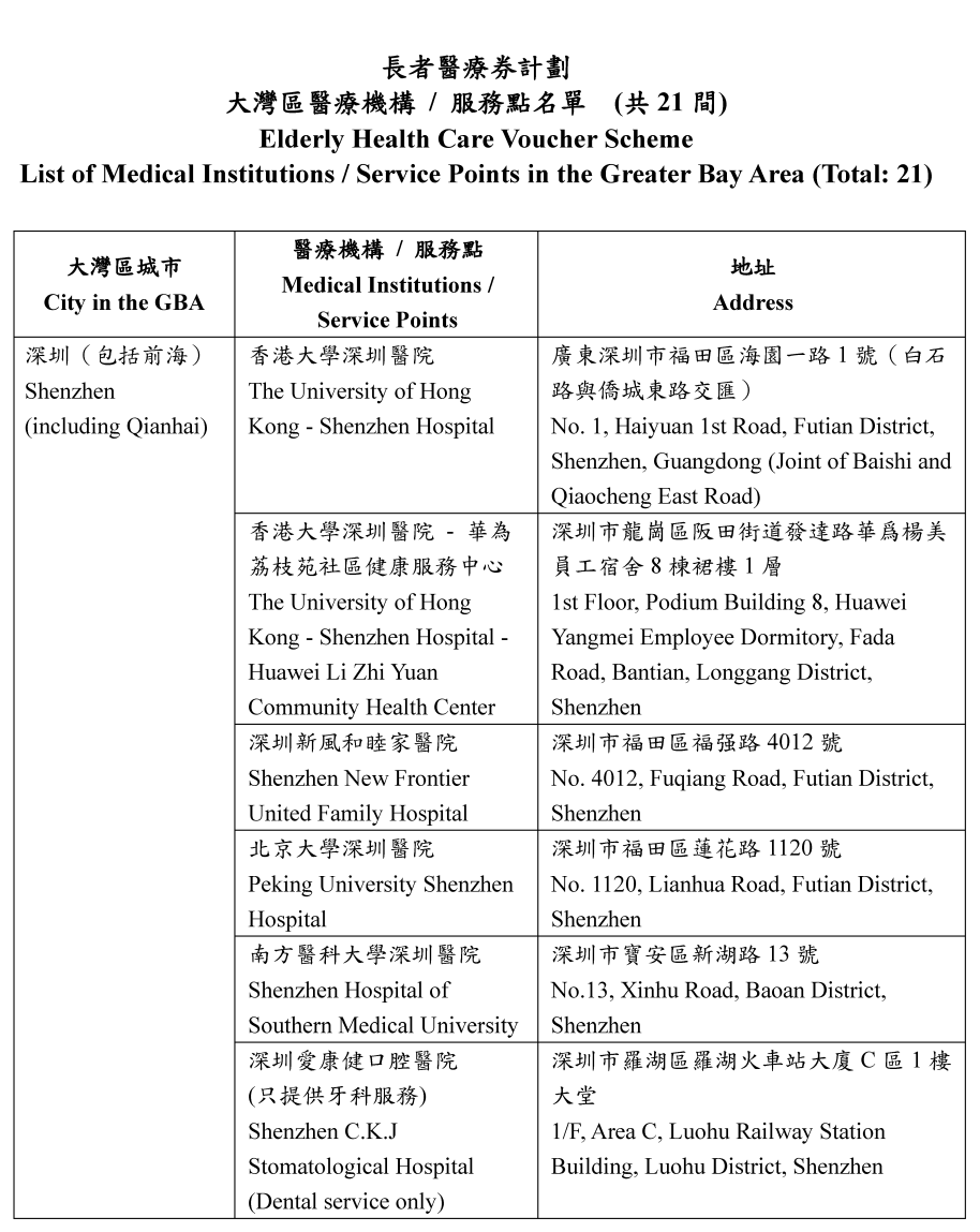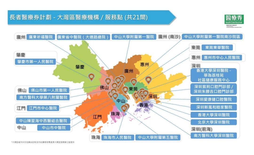 随着新增加的服务点,试点计划的医疗机构总数将增至19间,再加上香港大学深圳医院的一院两点,大湾区有合共21个服务点可供长者使用医疗券,受惠人数高达178万人。