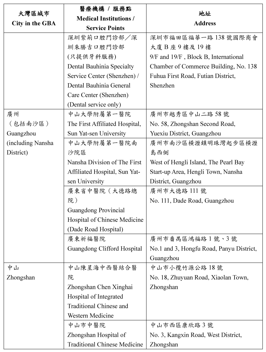特区政府衷心感谢广东省卫生健康委员会及相关城市的卫生部门对试点计划的大力支持和协助。随着新增的五间医疗机构投入服务,香港特区行政长官于2024年《施政报告》中提出的扩展试点计划至大湾区九个内地城市的目标将圆满达成。