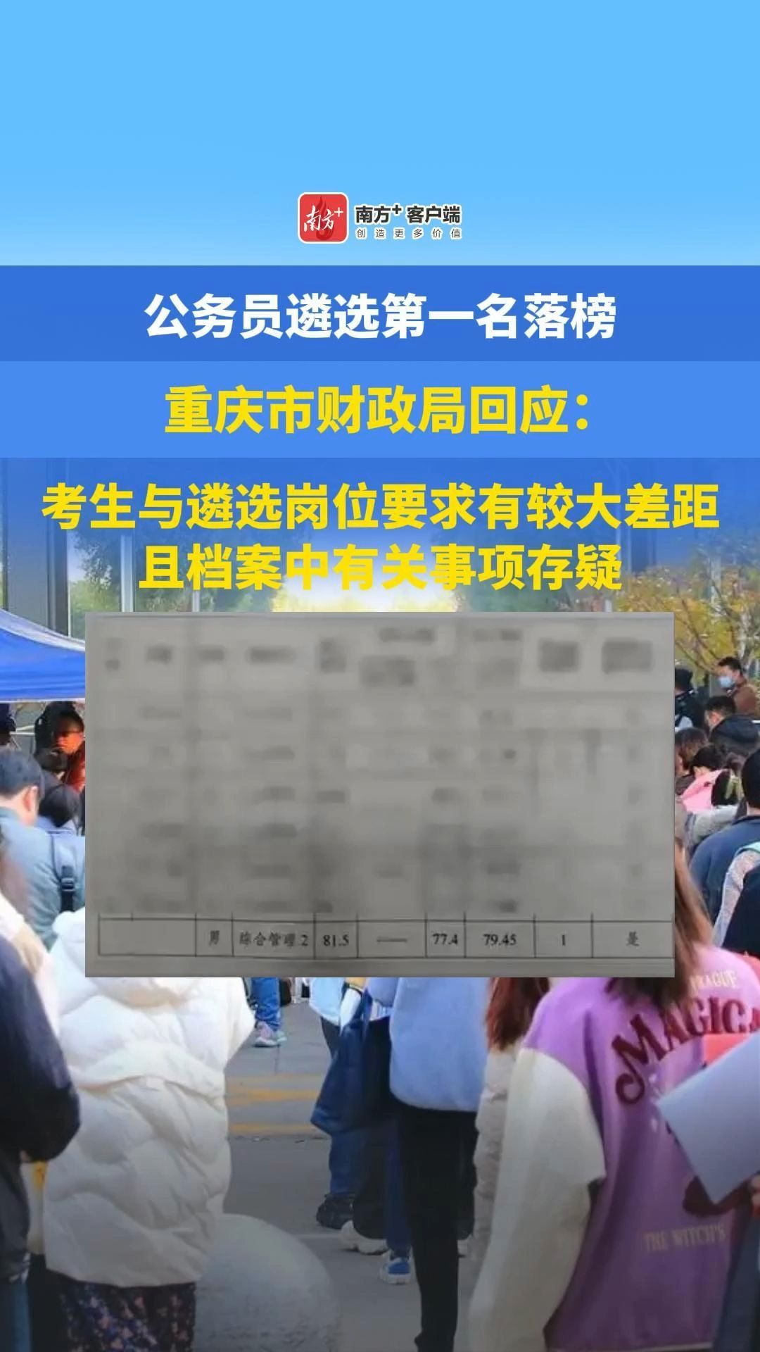 男子公务员遴选成绩第一却落选?重庆市财政局回应