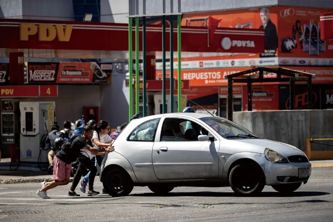 ▲2026年1月8日,委内瑞拉加拉加斯,人们推着一辆汽车经过国家石油公司的加油站 图/视觉中国