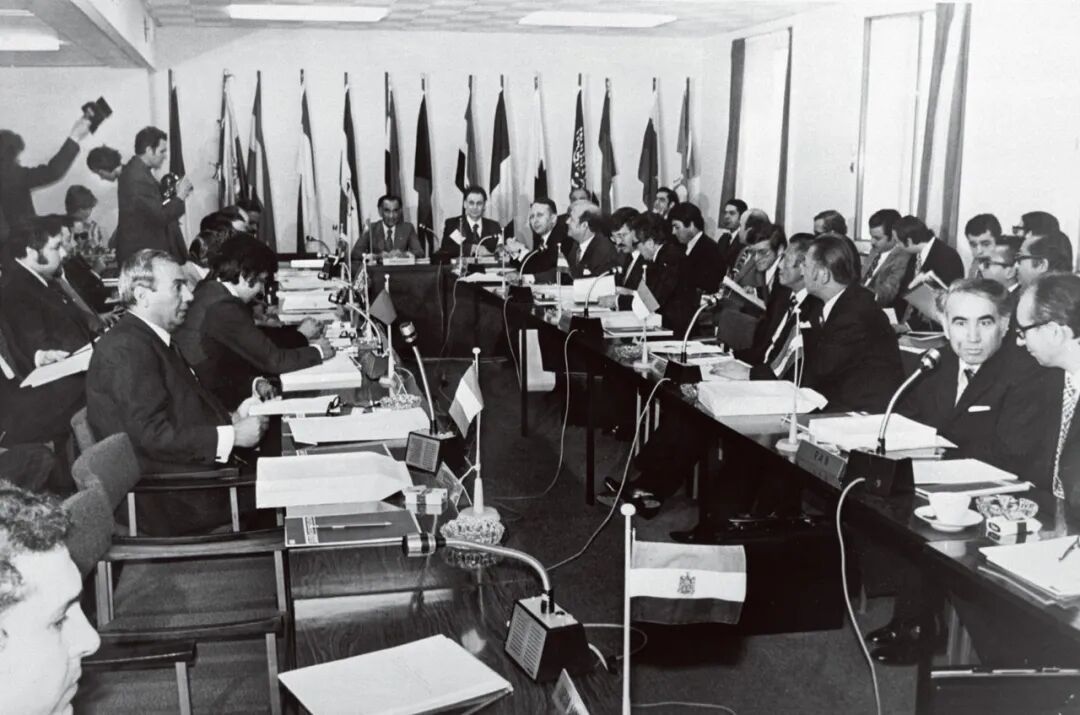 ▲1974年3月16日,奥地利维也纳,石油输出国组织 (OPEC) 召开为期两天的会议,旨在讨论原油价格。参与国家包括委内瑞拉、阿尔及利亚、厄瓜多尔、加蓬、印度尼西亚、伊朗、伊拉克、科威特、利比亚、尼日利亚、卡塔尔、沙特阿拉伯、阿拉伯联合酋长国、特立尼达和多巴哥 图/视觉中国
