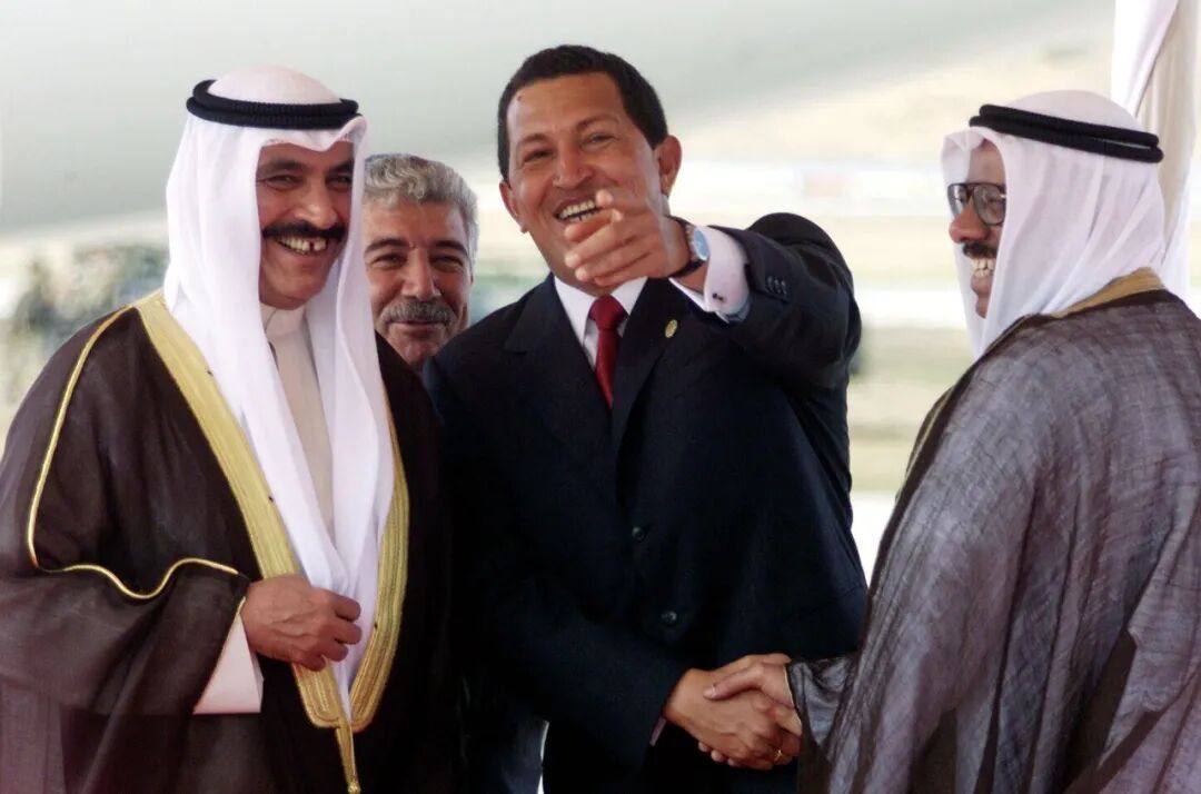 ▲2000年9月26日,委内瑞拉加拉加斯,石油输出国组织 (OPEC) 峰会开幕,时任委内瑞拉总统查韦斯 (中) 在欢迎仪式上和科威特石油大臣沙特·纳赛尔·萨巴赫 (左) 对着镜头大笑 图/视觉中国
