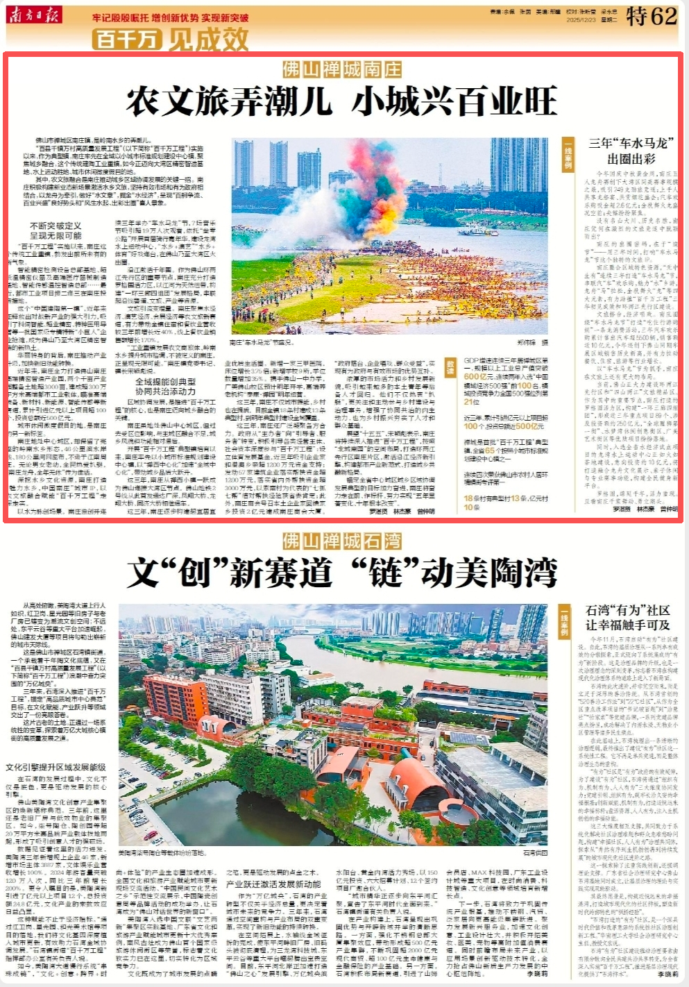 “百县千镇万村高质量发展工程”(以下简称“百千万工程”)实施以来,作为典型镇,南庄率先在全域以小城市标准规划建设中心镇,聚焦城乡融合,这个传统建陶工业重镇,如今正迈向大湾区精密智造基地、水上运动胜地、城市休闲微度假目的地。