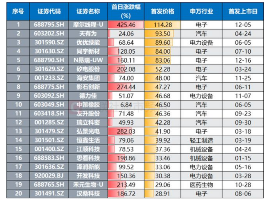 据财联社统计,新股市场热度持续,截至12月16日,在目前市场高股价标的中,有不少为年内上市新股,以股价居前的30只个股计算,除昂瑞微外,另有海博思创、矽电股份、影石创新、摩尔线程4股为今年上市。