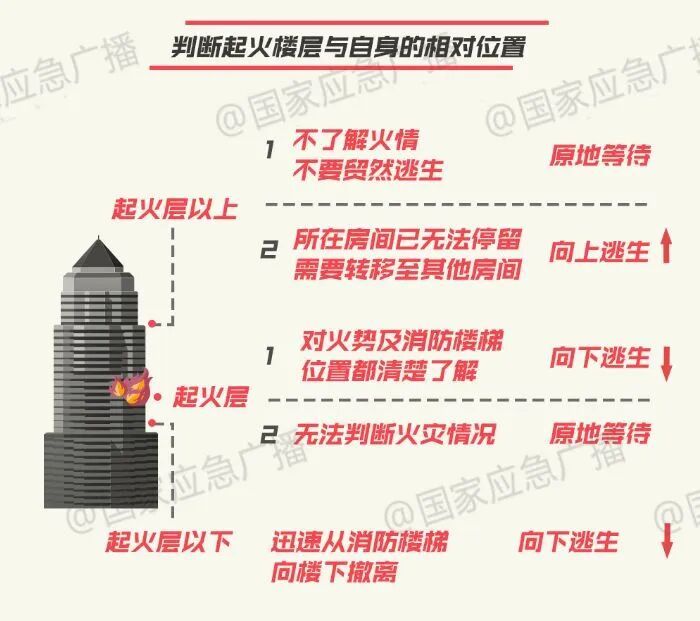 火灾发生在上方楼层,从容向下撤离,记得关闭窗户,防止火星进入;火灾来自同一楼层或下方,且疏散楼梯间无明显烟气,应尽快向下跑。