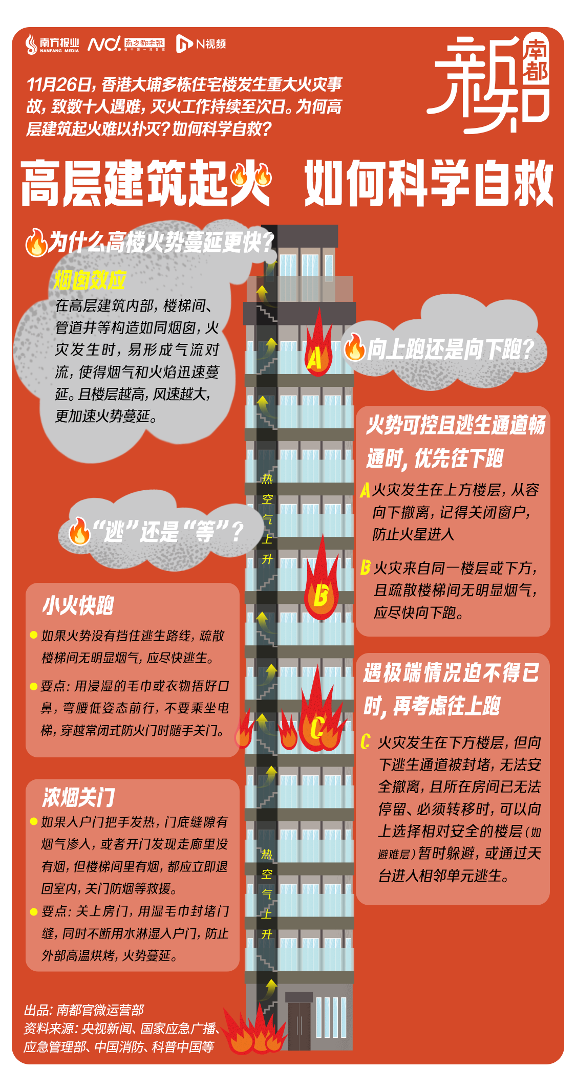 11月26日,香港大埔多栋住宅楼发生重大火灾事故,致数十人遇难。至次日晚,灭火救援工作仍在继续。为何高层建筑起火难以扑灭?如何科学自救?
