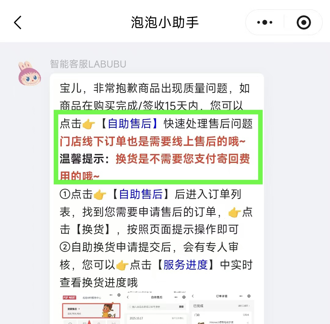 泡泡玛特售后服务中心表示:“线下门店订单也要线上售后”。
