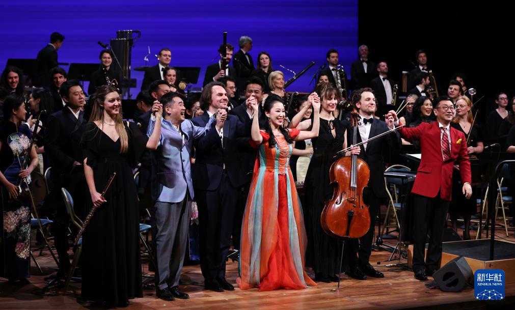 2024年1月31日,在法国巴黎凡尔赛宫皇家歌剧院举行的庆祝中法建交60周年暨中法文化旅游年开幕音乐会上,全体演员向观众致意。(新华社记者 高静/摄)