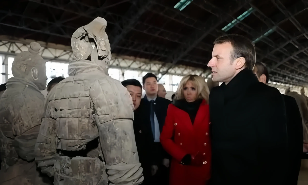 2018年1月,马克龙与妻子在位于陕西省西安市的秦始皇帝陵博物院参观。(新华社)