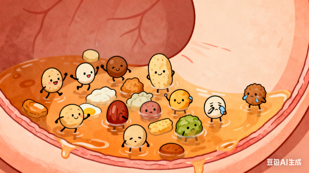 正常进食时,迷走神经(主导“休息与消化”)占优,促进消化。进食过快则引发应激反应,激活交感神经(主导“战斗或逃跑”),抑制迷走神经,导致胃肠血流减少、消化液分泌下降、蠕动减慢,引起腹胀、反酸;同时促使胰高血糖素、肾上腺素等应激激素释放,升高血糖、血压,降低消化效率[3,4]。