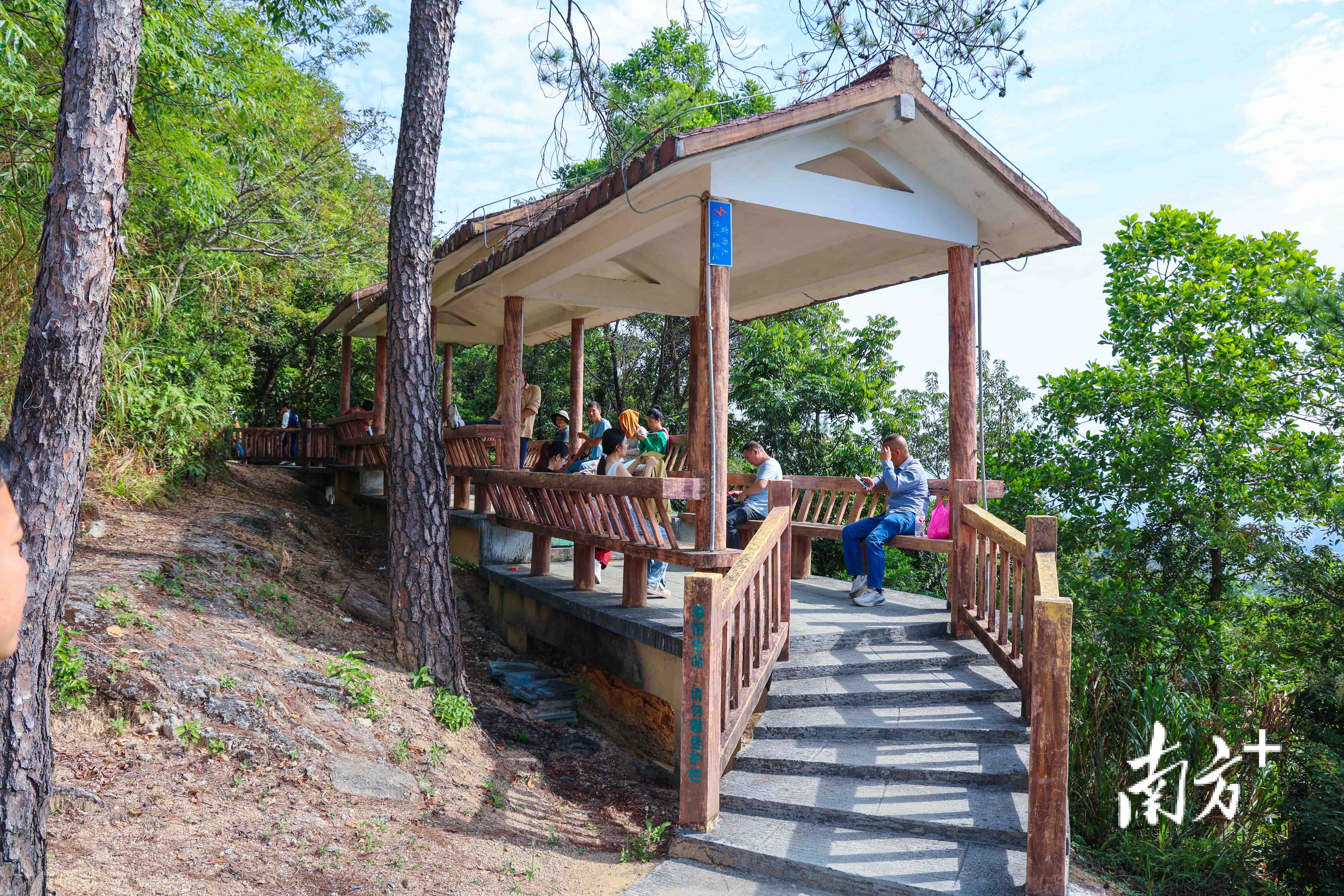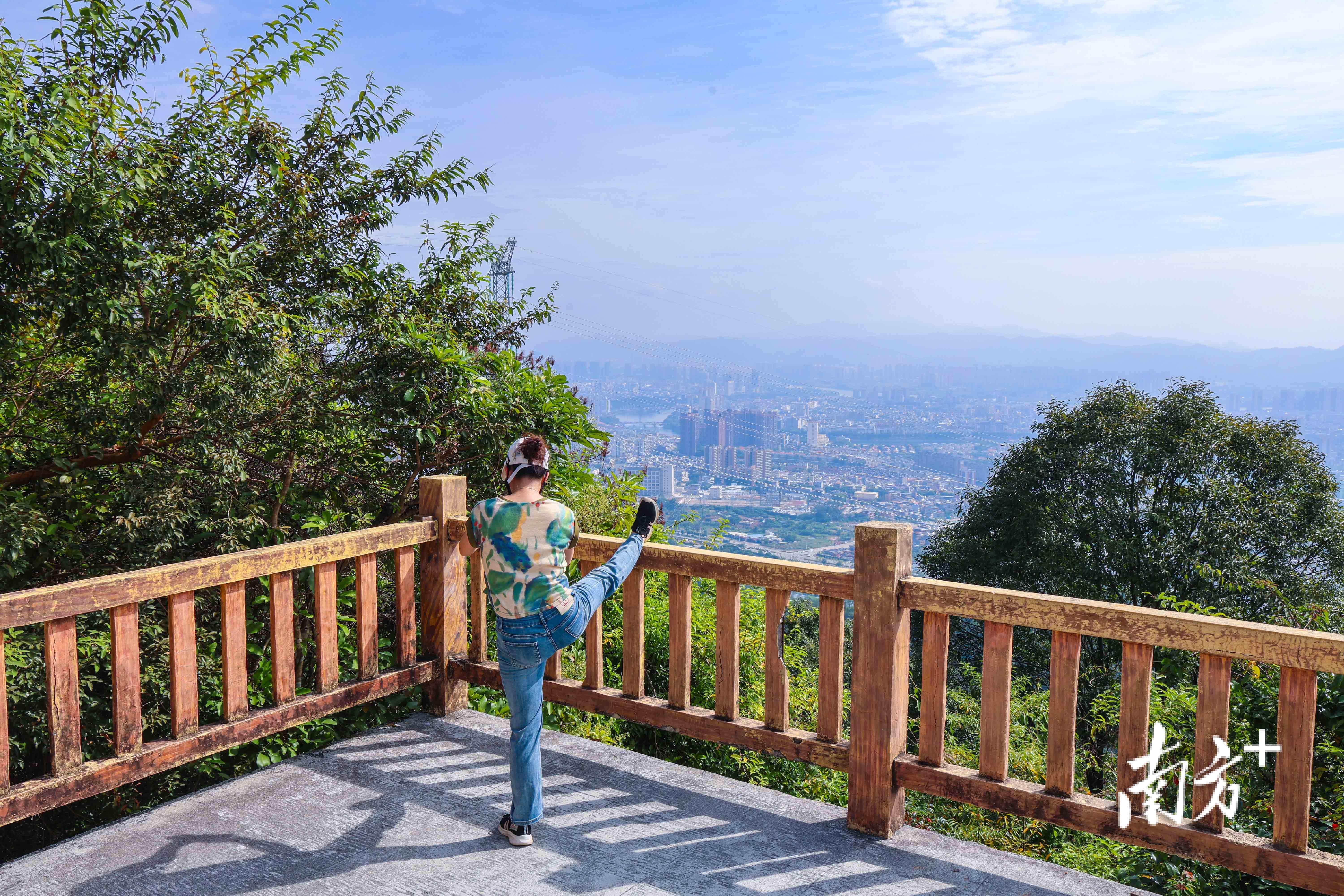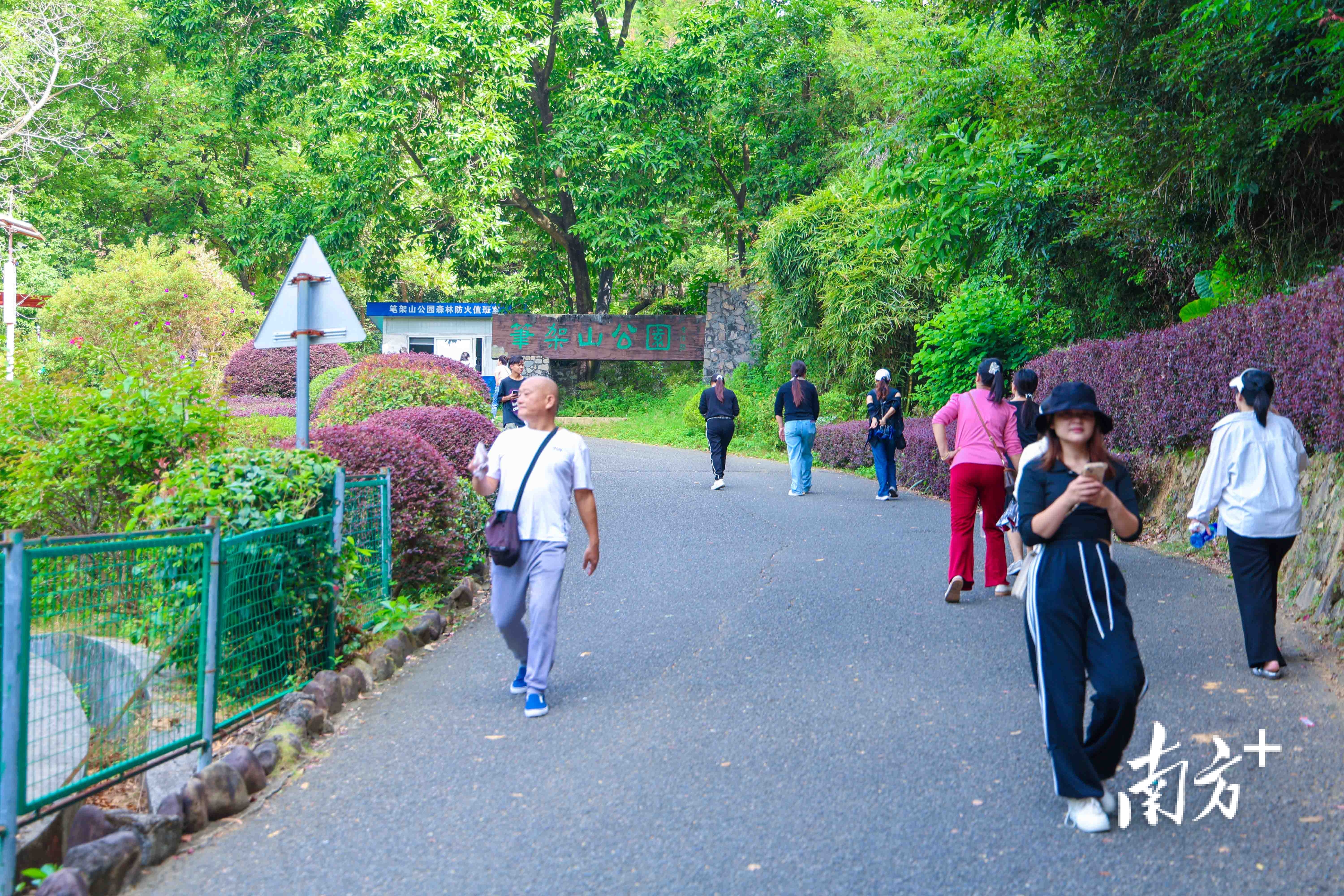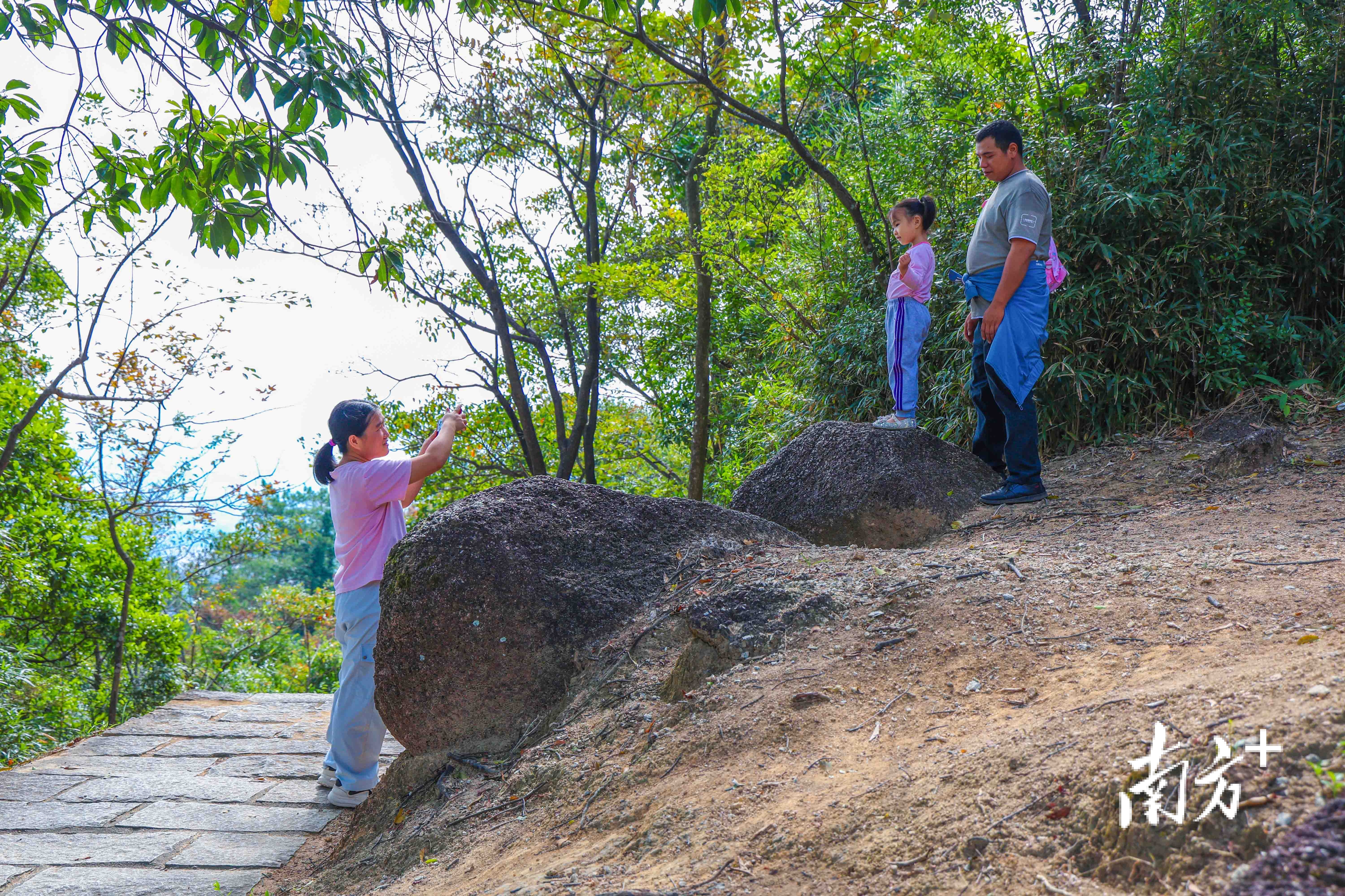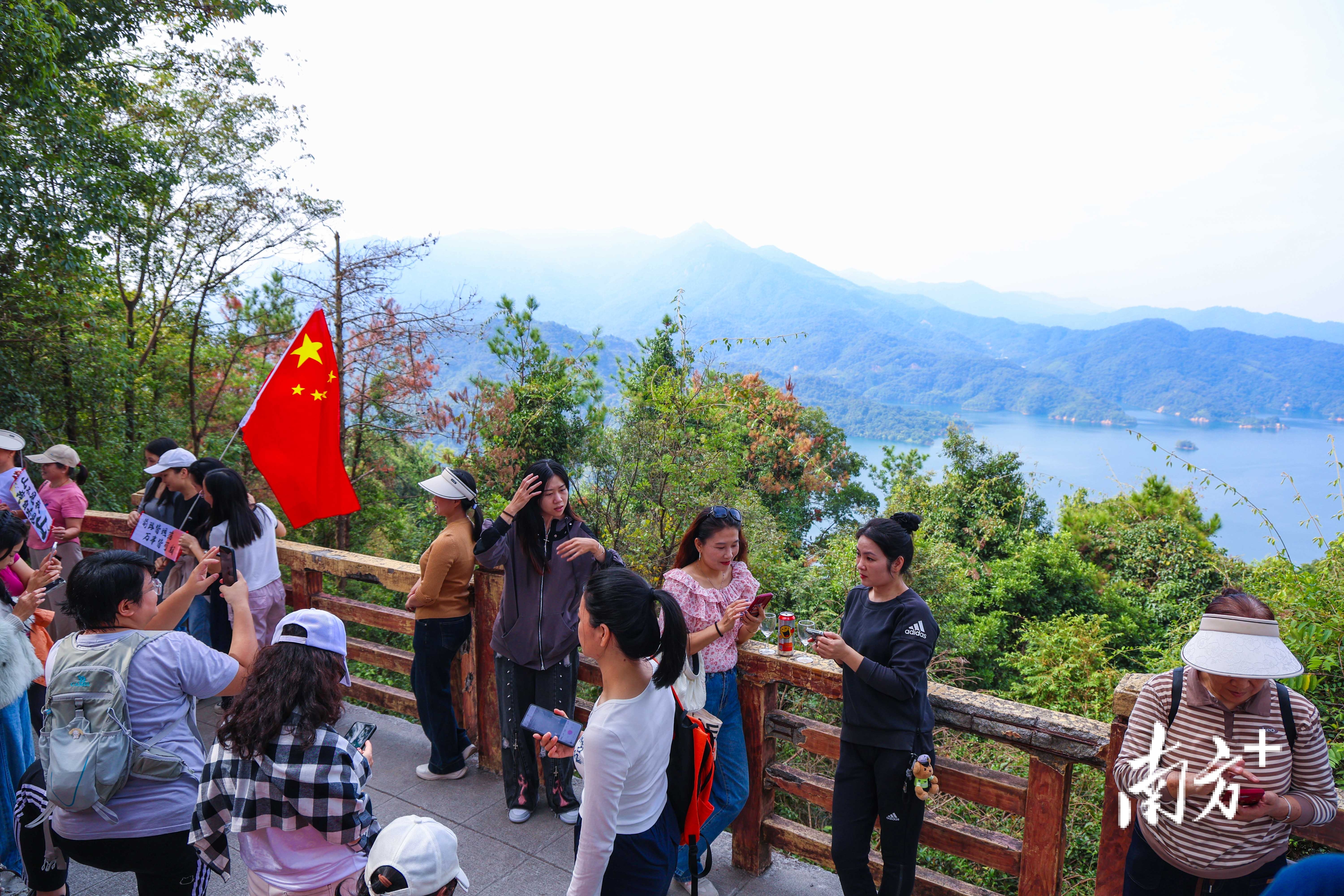 登山道上,市民络绎不绝,有人挎着水壶接山泉水解渴,有人在观景台举手机拍新丰江大坝,更有家长蹲下身子为孩子留影,定格成长瞬间。