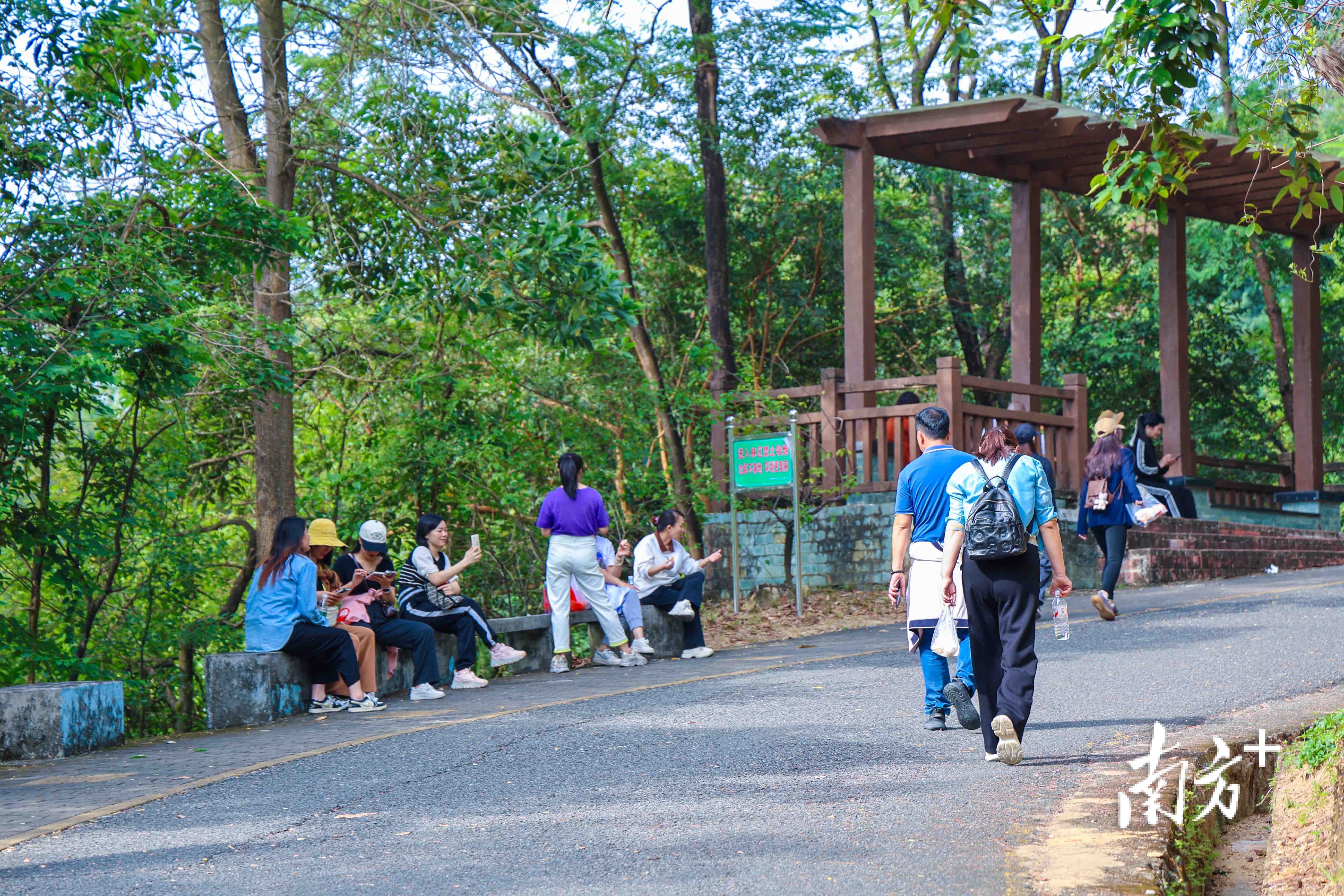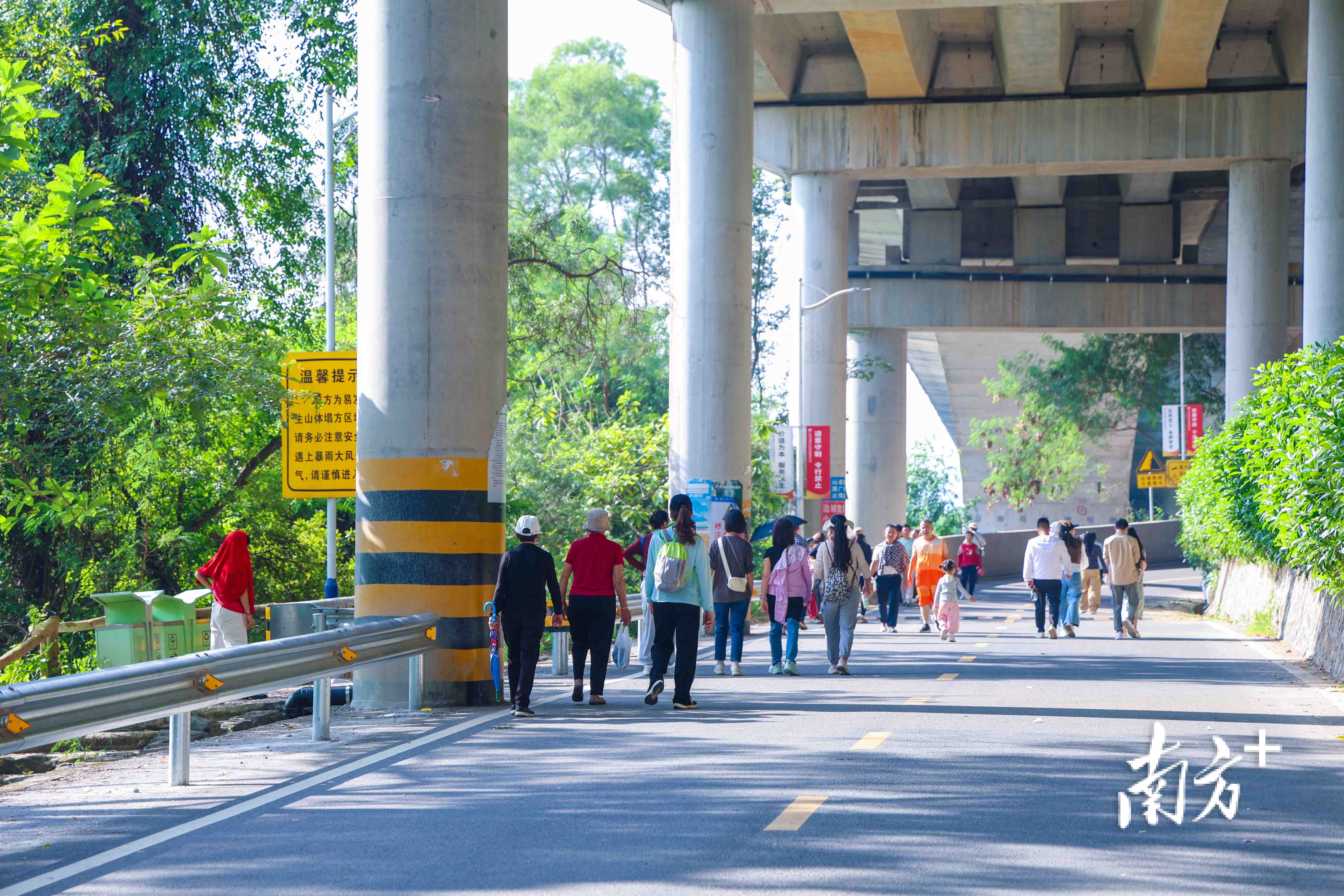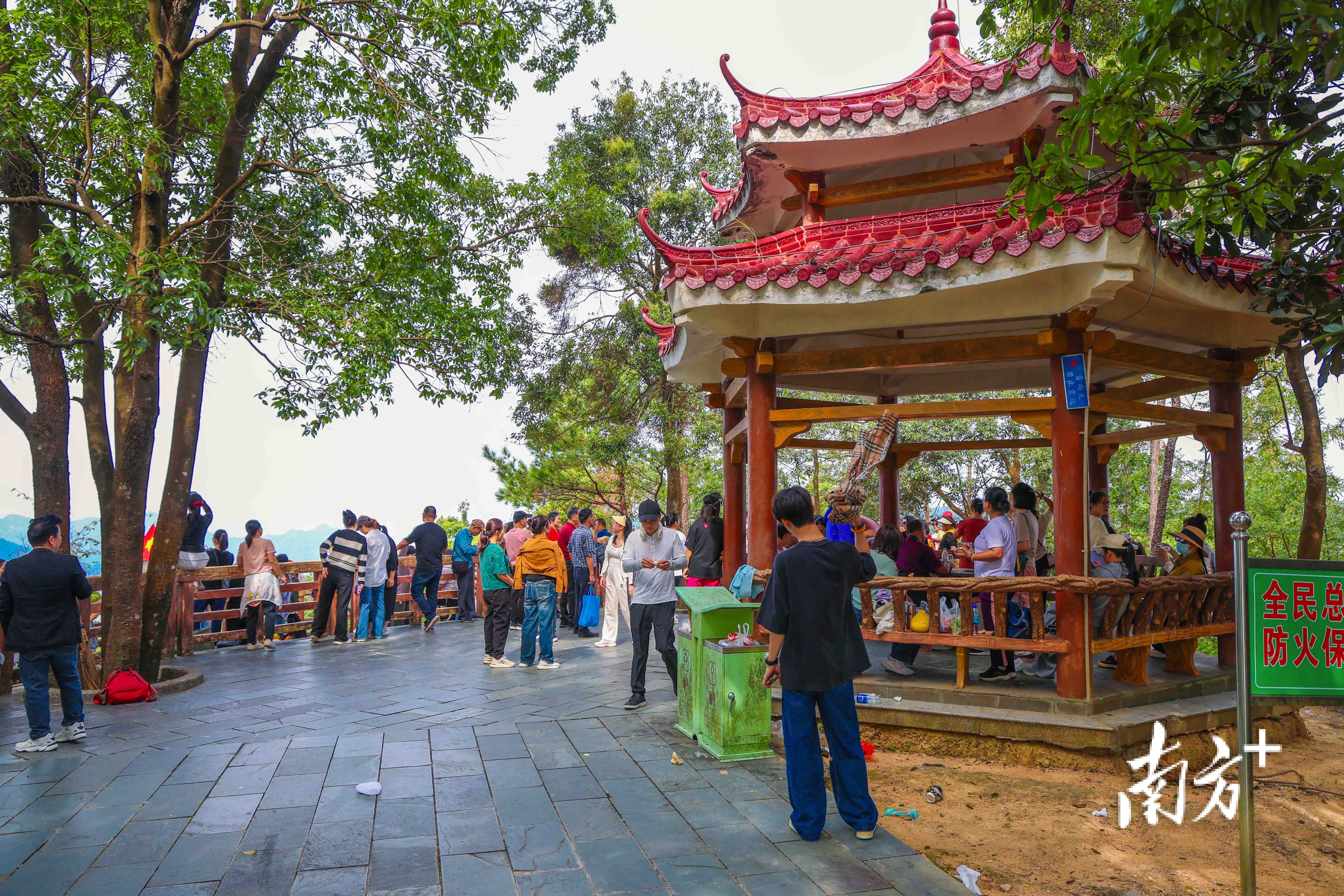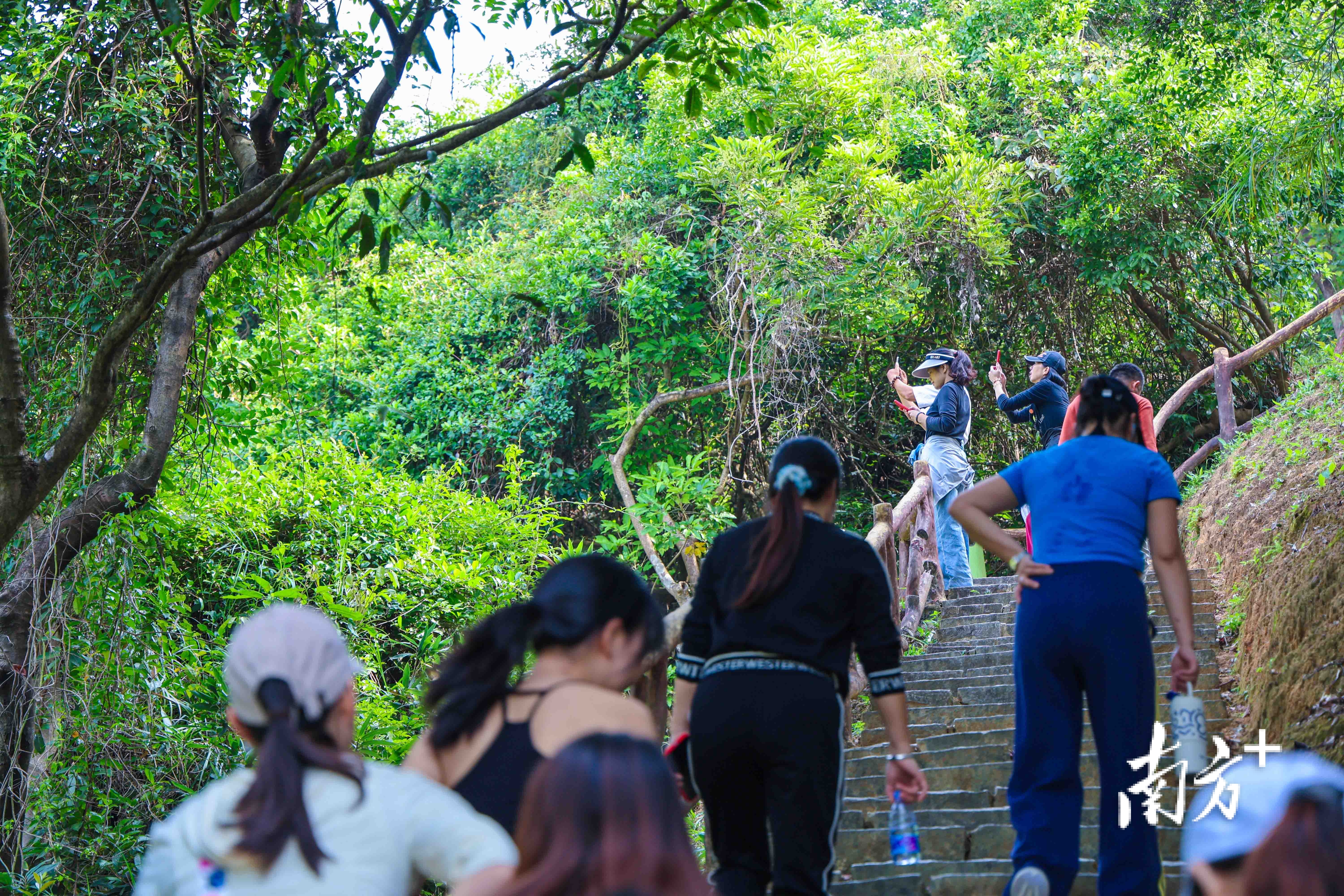 登山道上,市民络绎不绝,有人挎着水壶接山泉水解渴,有人在观景台举手机拍新丰江大坝,更有家长蹲下身子为孩子留影,定格成长瞬间。