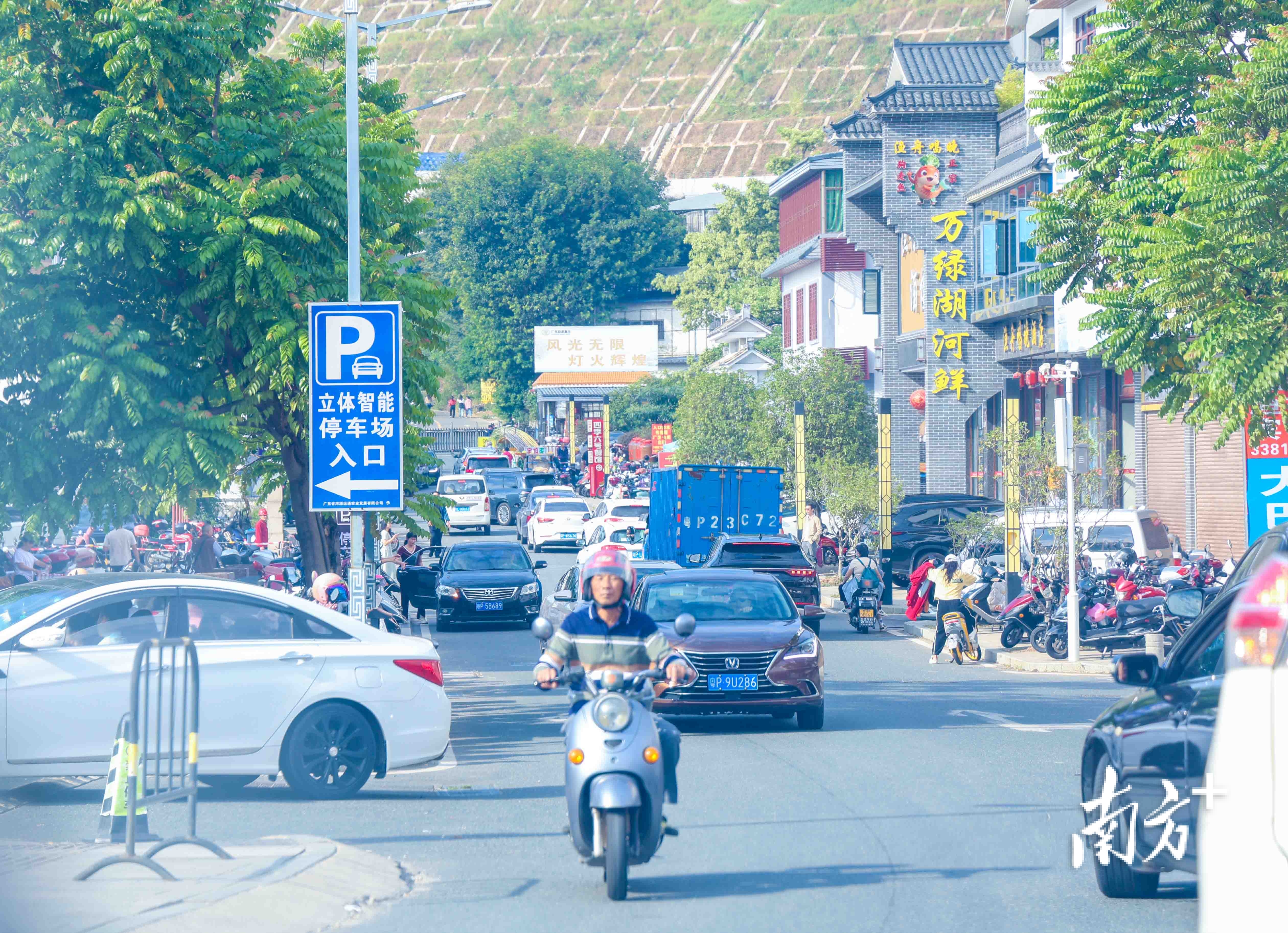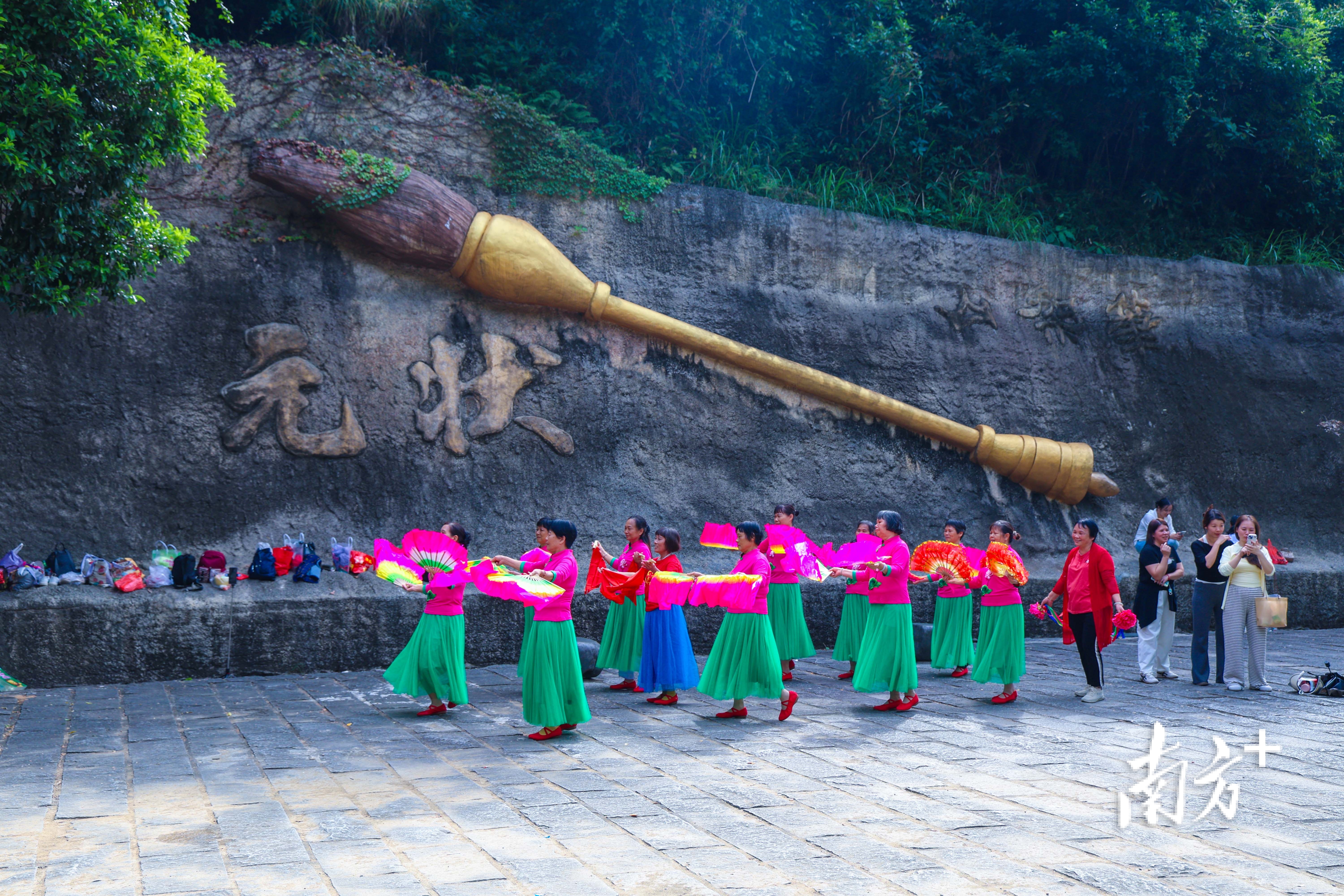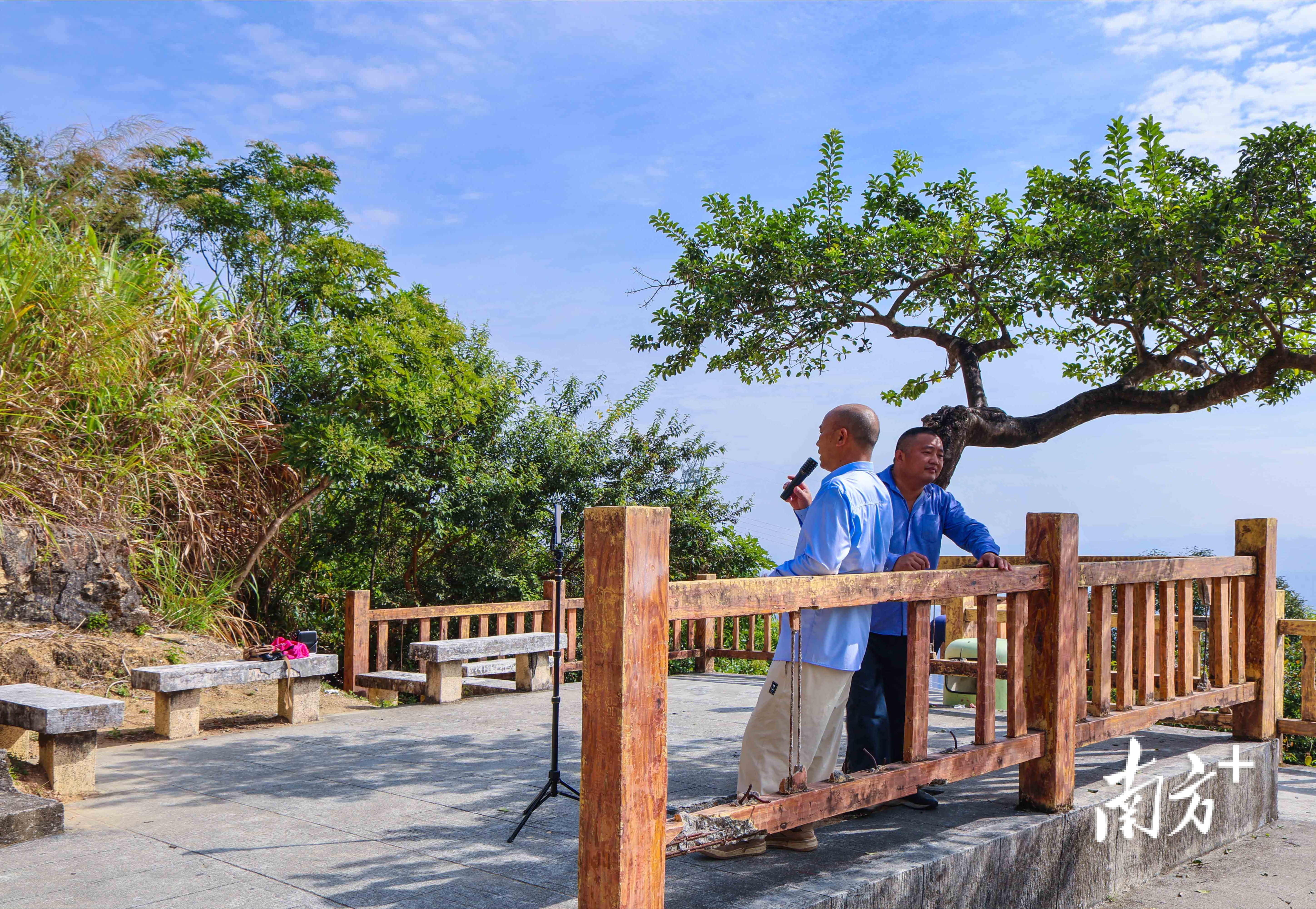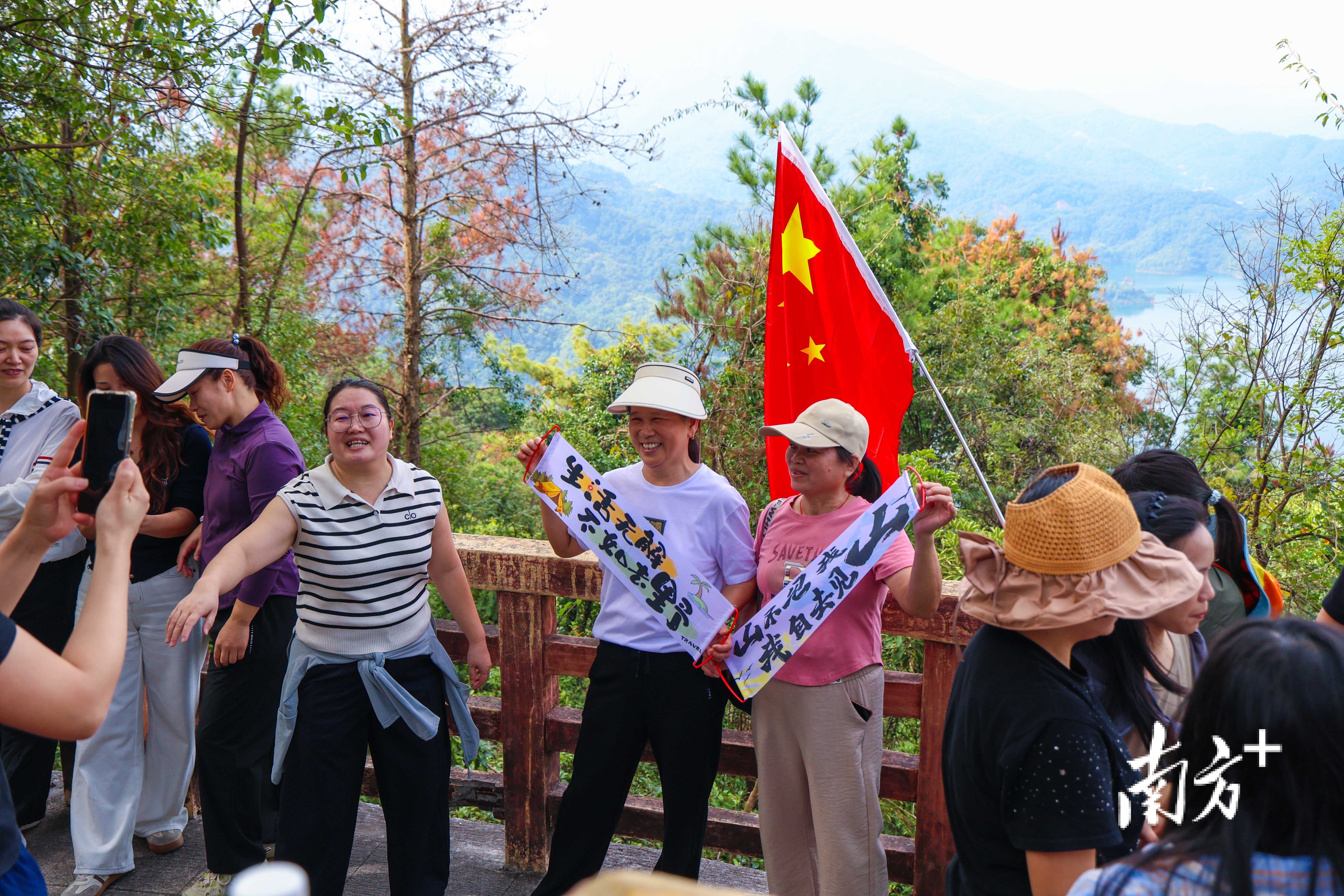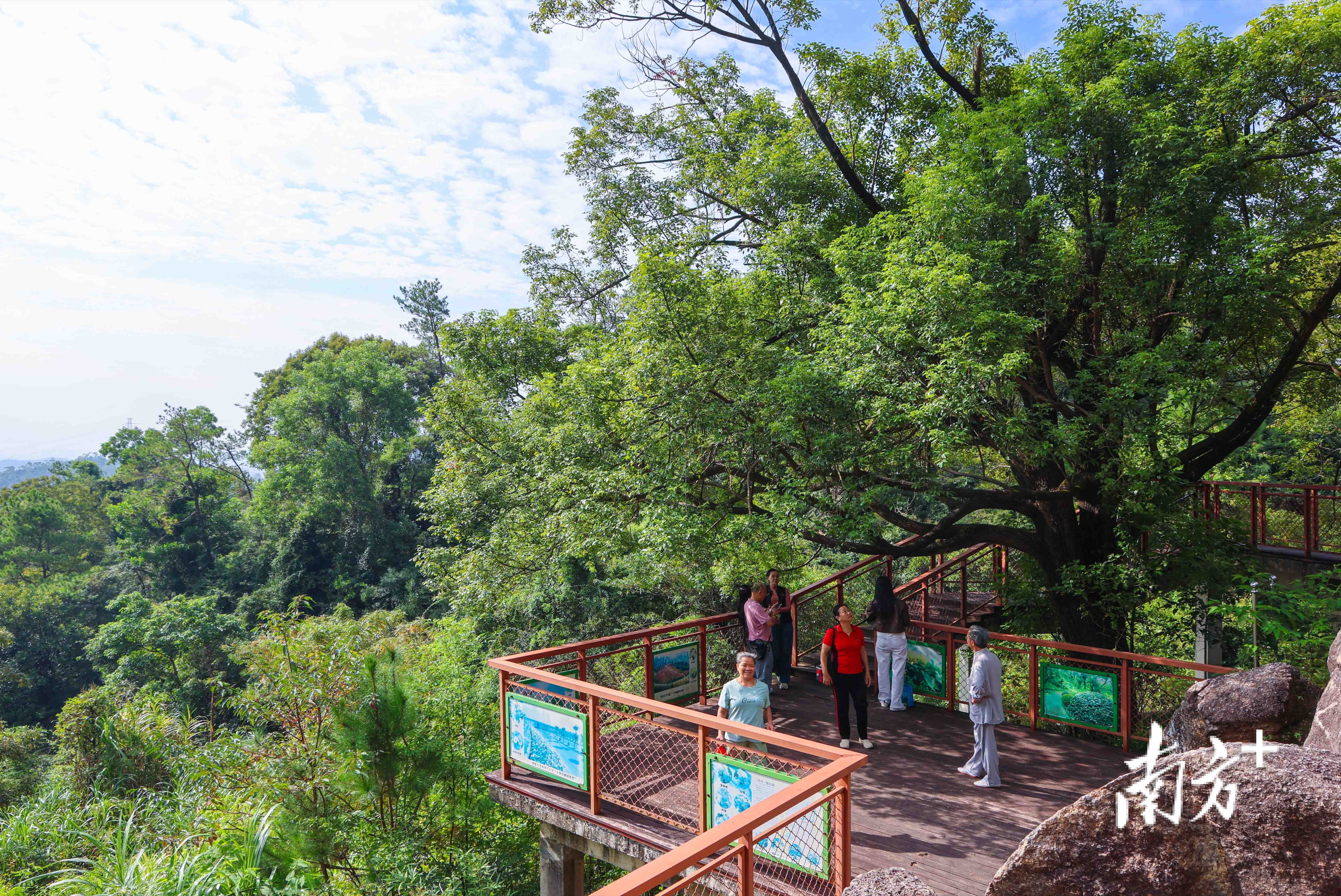 登山道上,市民络绎不绝,有人挎着水壶接山泉水解渴,有人在观景台举手机拍新丰江大坝,更有家长蹲下身子为孩子留影,定格成长瞬间。
