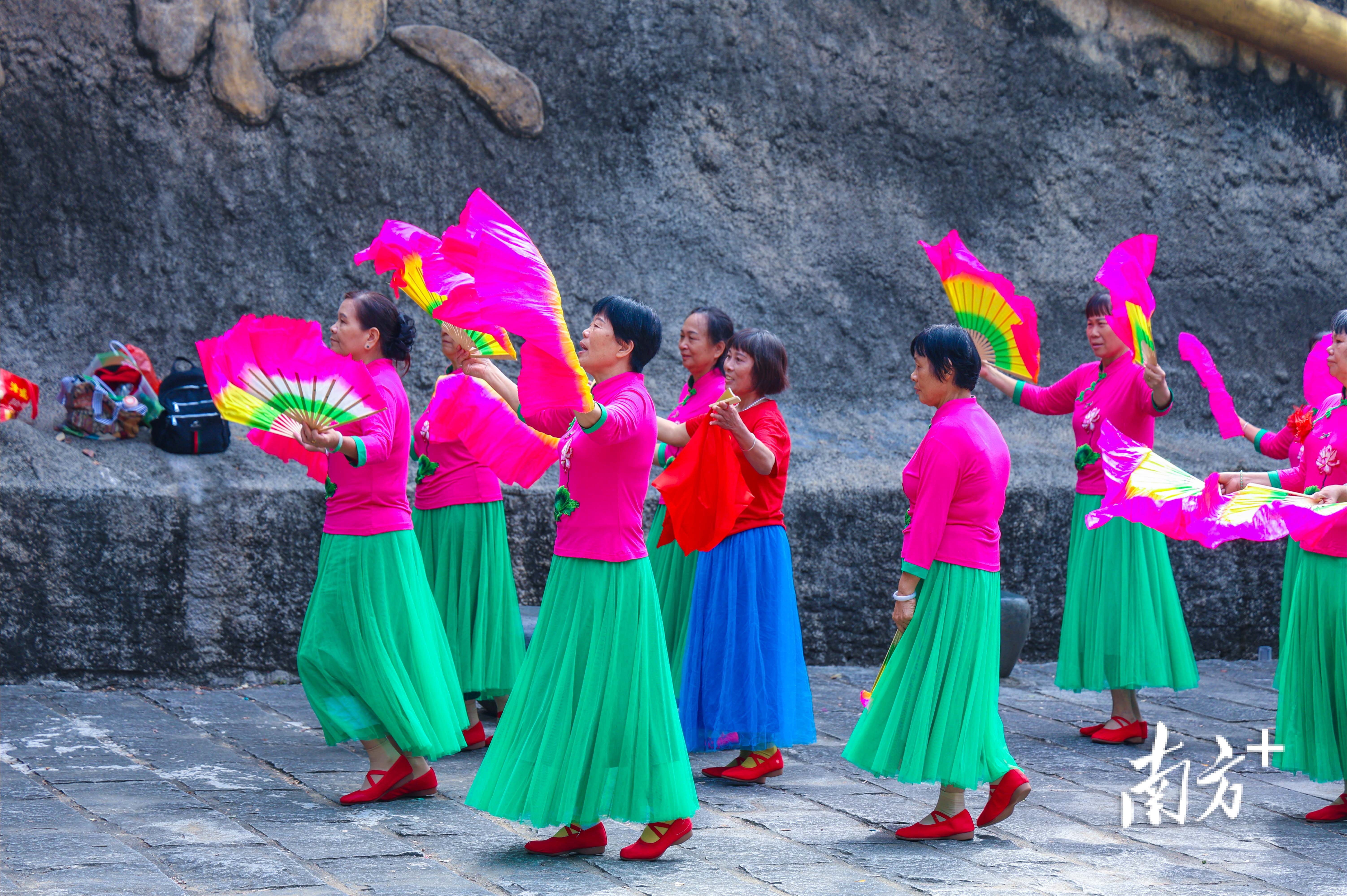 一群初中生举班旗研学,围听老师讲状元由来;不远处,老年舞蹈队正挥扇起舞,红绸翻飞间,传统与活力交织。