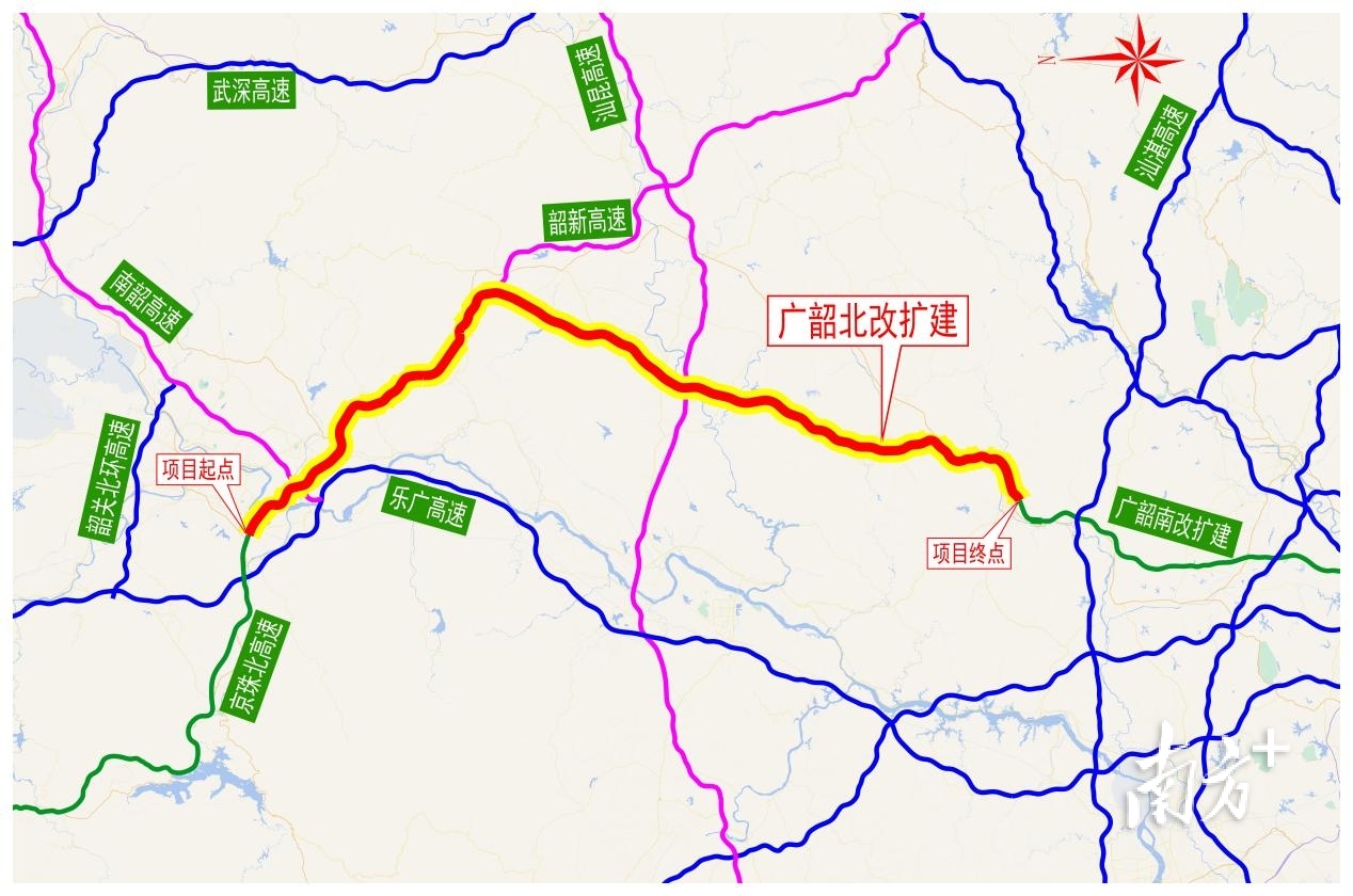 为进一步满足人民群众美好出行的需求,广韶高速分段推进改扩建。2023年9月,广韶高速佛冈至太和段改扩建工程(即“广韶高速改扩建项目南段”)率先启动,全长72.6公里,由双向六车道扩建为双向十车道,计划于2027年建成通车。广韶高速北段改扩建项目起于韶关市武江区西联镇,途经浈江区、曲江区、翁源县和清远市英德市、佛冈县,终于佛冈县石角镇,顺接广韶高速改扩建项目南段,全长125.6公里。全线设桥梁123座,隧道4座,互通立交12处,服务区3对,计划于2029年全面建成通车。