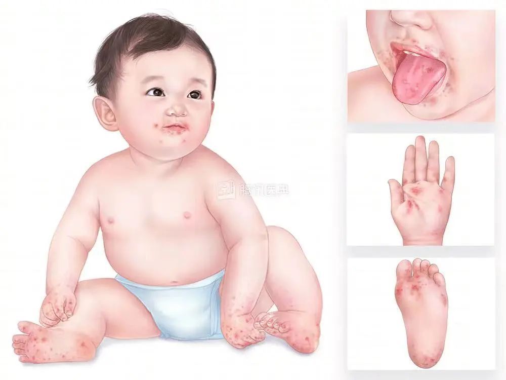 一是手足口或关键部位出疹,娃的手掌、脚掌、口腔黏膜会出现红色疹子,部分疹子会带小水泡;有些还会蔓延到膝关节、肘关节周围,甚至臀部皮肤,疹子不疼不痒,但会逐渐增多;