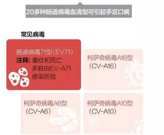 导致手足口病主要的病原体是EV71和CoxA16,而EV71型更容易导致重症甚至死亡,市面上的疫苗也是针对EV71病毒的。
