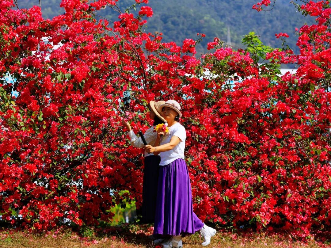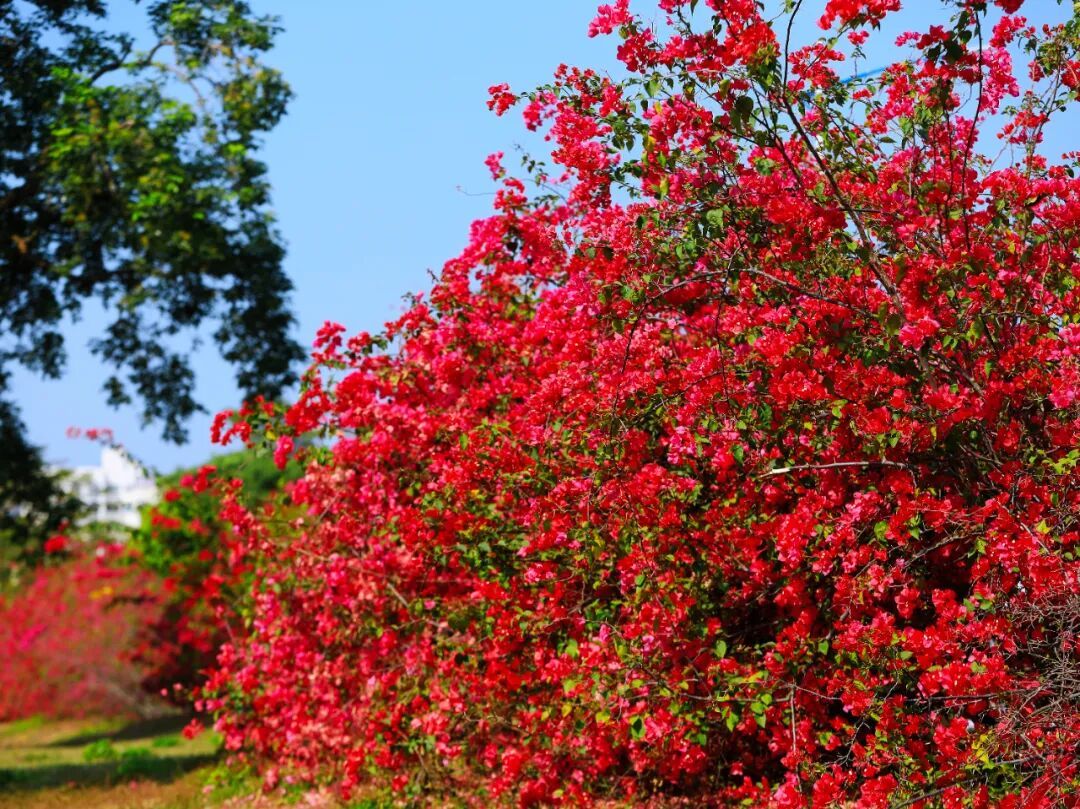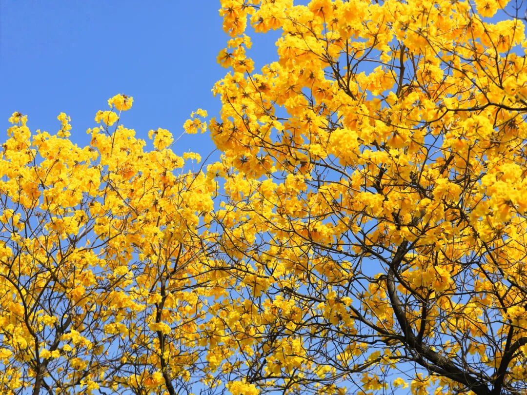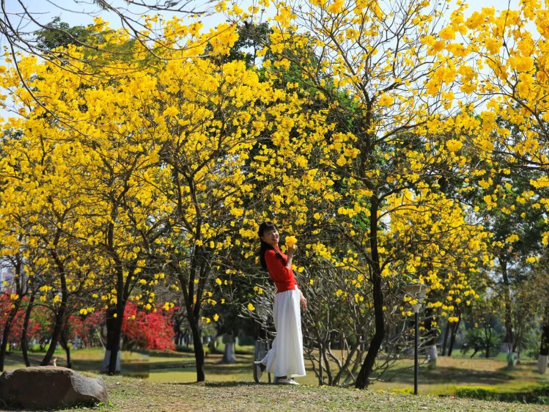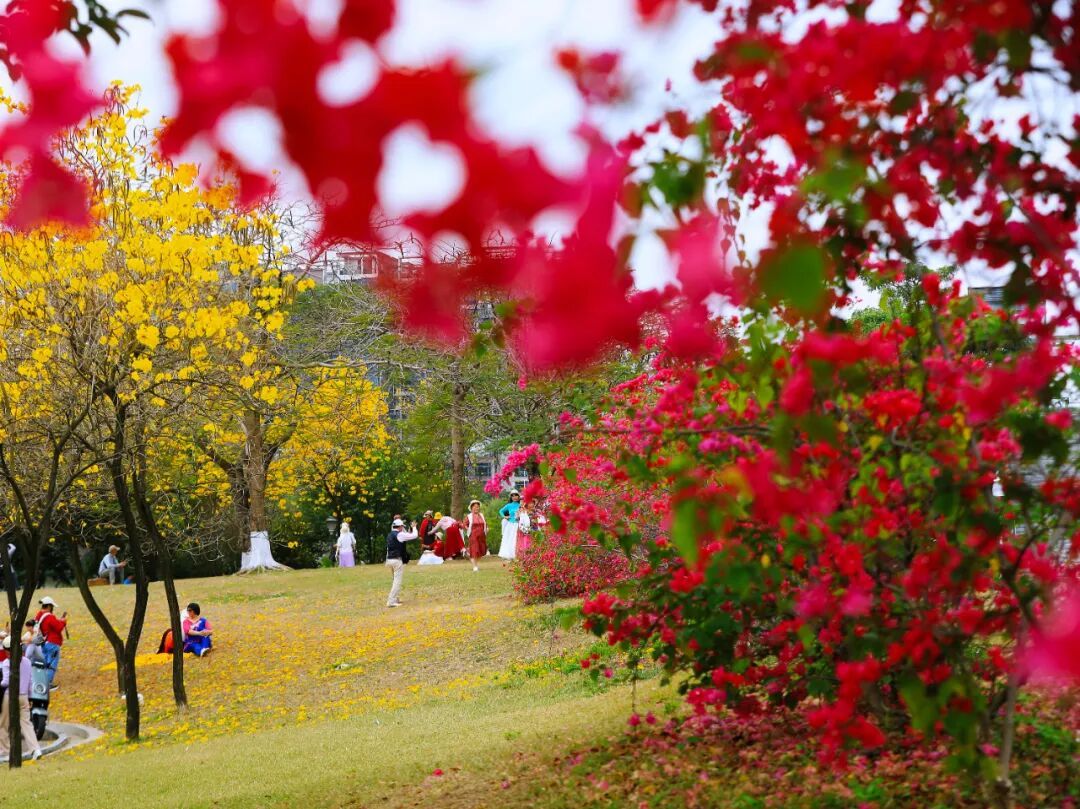 艳红似火的花朵层层叠叠、肆意绽放,与一旁金黄明媚的黄花风铃木相互映衬,一红一黄,一热烈一温婉,撞出最动人的春日色彩。