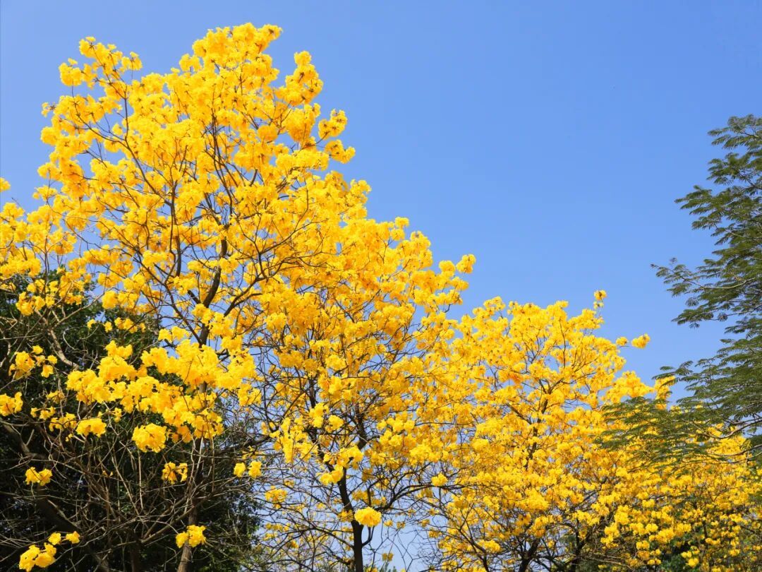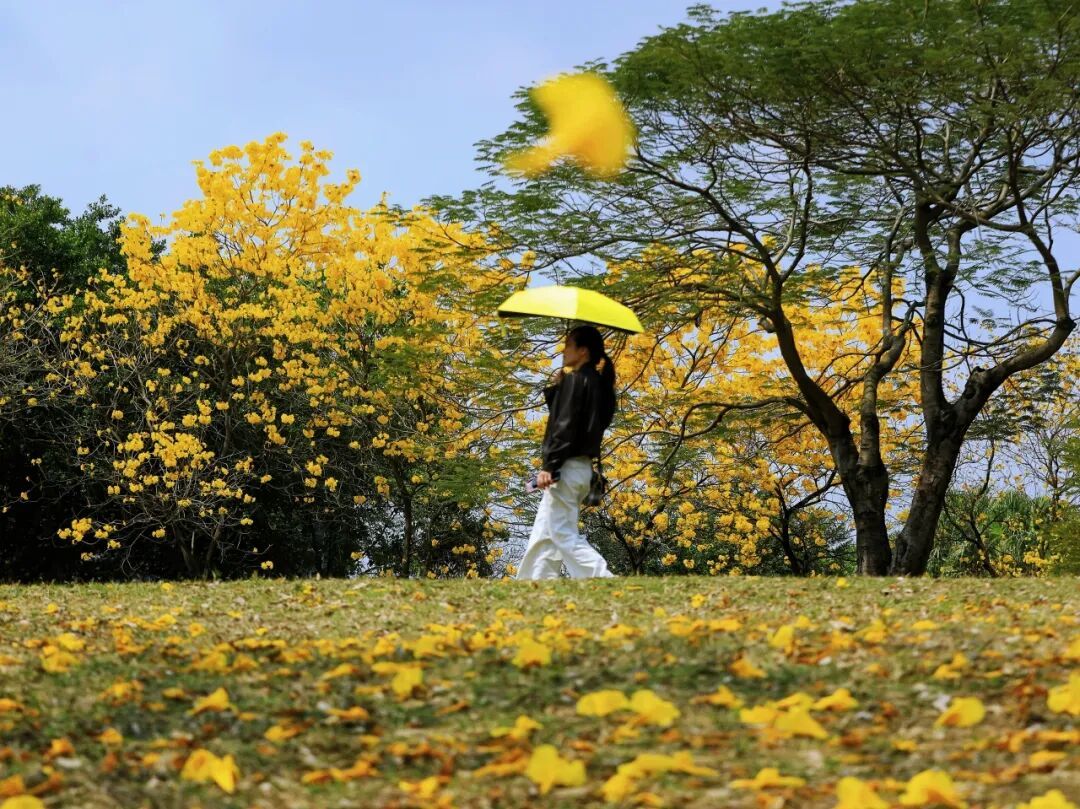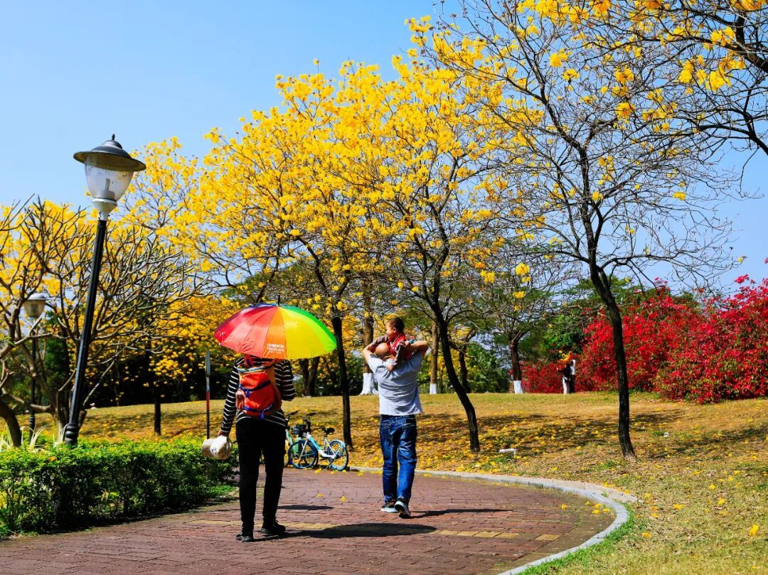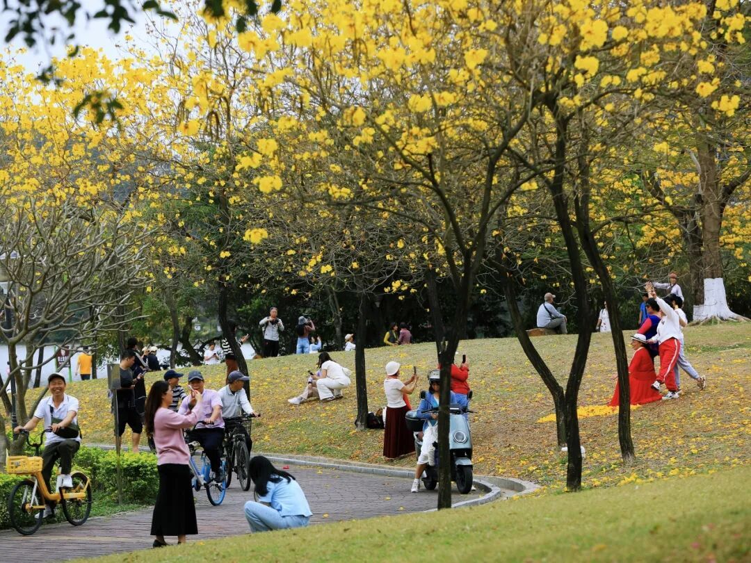 近日阳光正好,肇庆市端州区波海公园里的黄花风铃木迎来了盛放期,满树繁花金灿灿一片,开得热烈又灿烂。