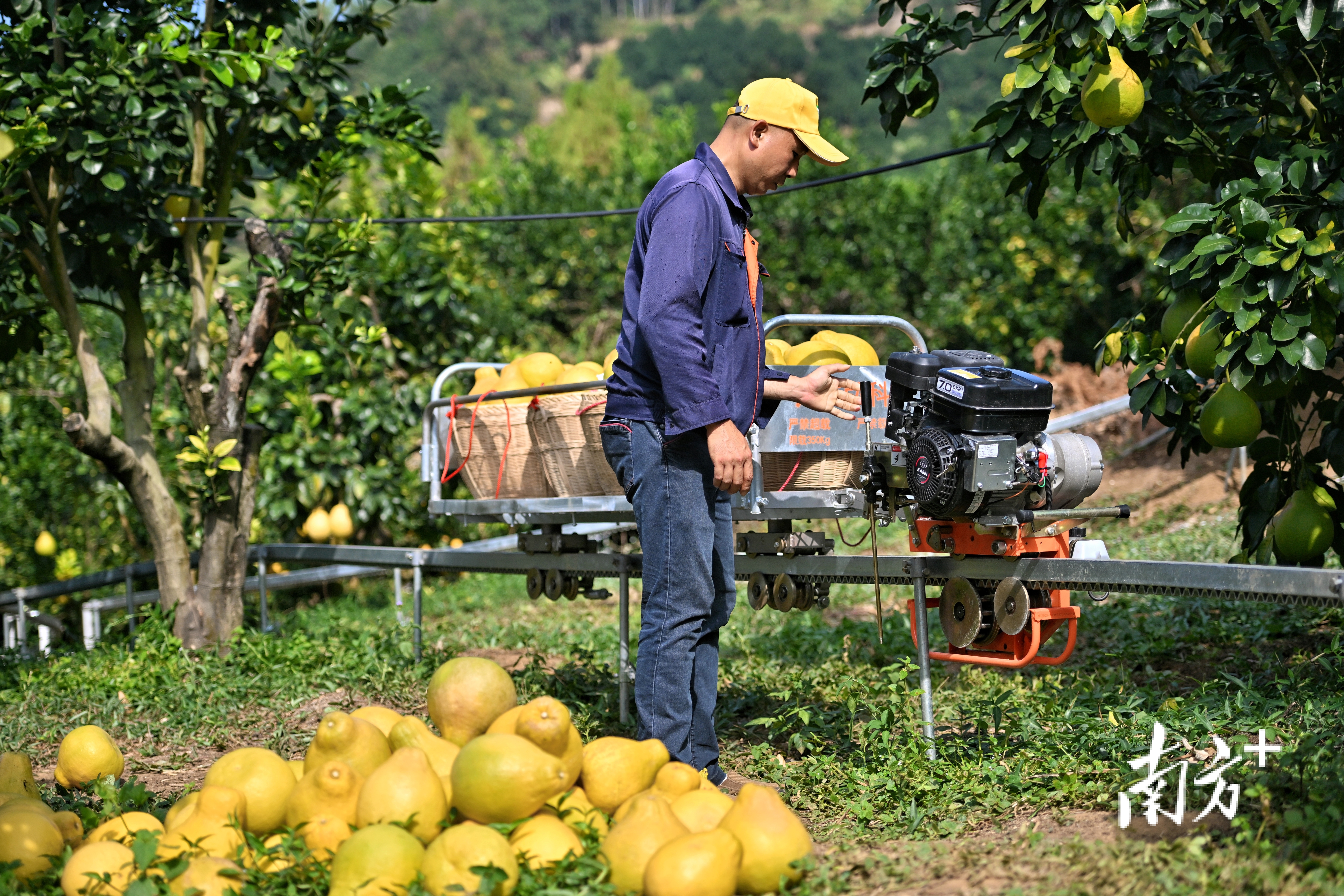 雁洋镇南福金柚种植基地里,轨道运输车的铺设有效提高柚农们的工作效率。 南方+记者 何森垚 摄.