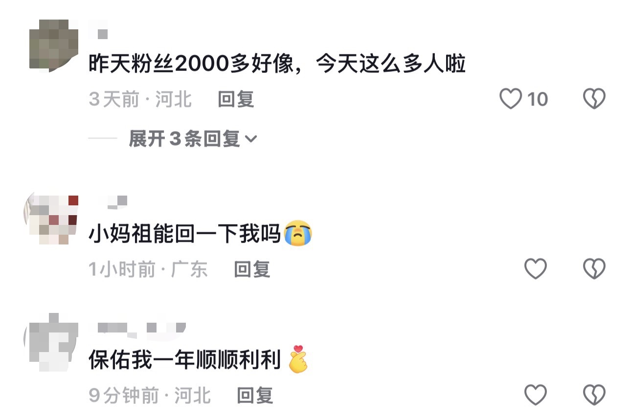 随着真相浮出水面,许某蓝此前开设的抖音账号“爱吃可乐鸡翅”粉丝量迅速攀升至66.6万,单条视频点赞超150万。评论区也悄然变味,涌入了大量祈福留言:“考研上岸”“家人安康”“生意兴隆”……俨然一个“网络许愿池”。