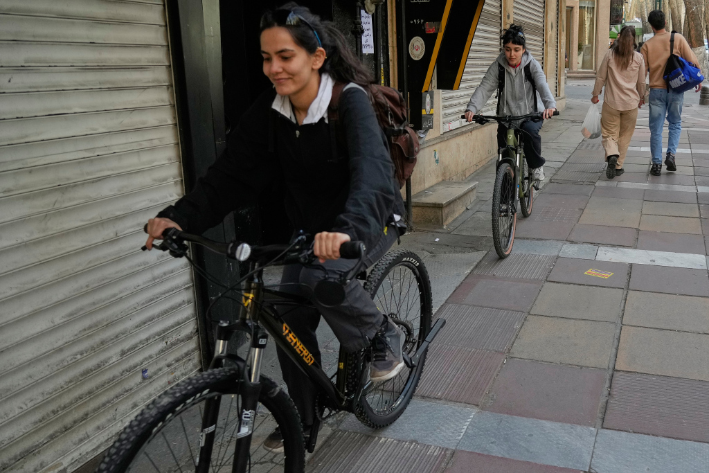 当地时间2026年2月20日,伊朗德黑兰北部,当地民众骑着自行车出行。