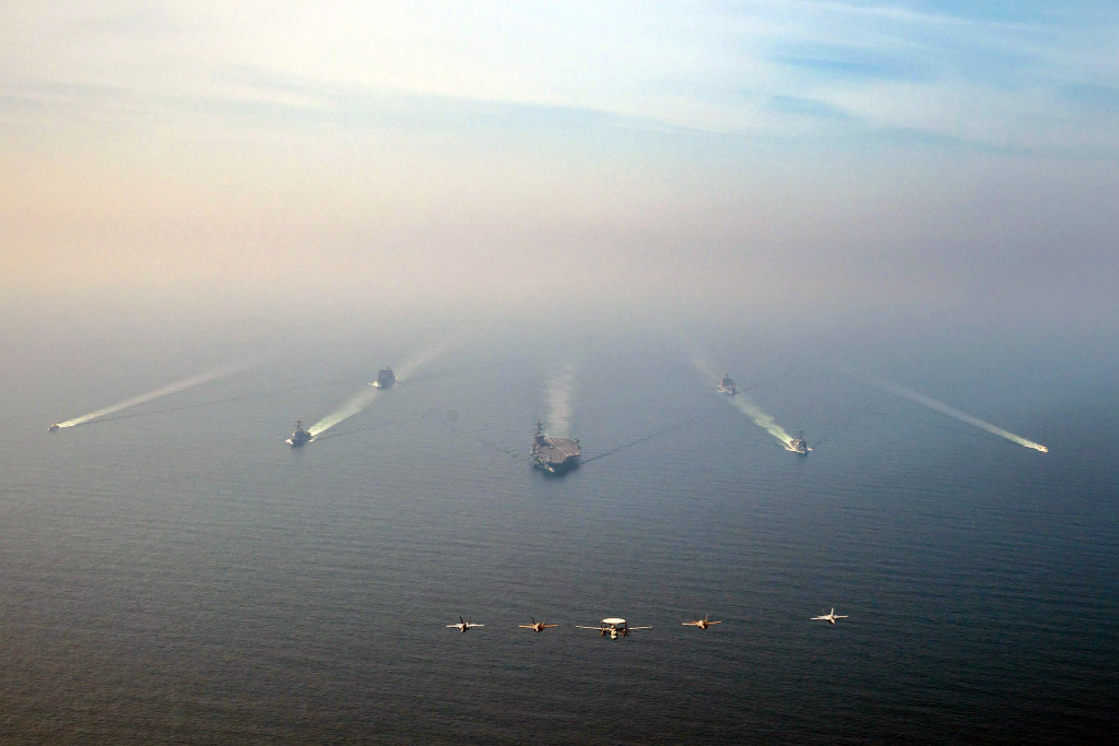 当地时间2026年2月6日,阿拉伯海,美国海军“林肯”号航母打击群在阿拉伯海海域航行,两艘军事补给舰和两艘美国海岸警卫队舰艇为其护航,第九舰载机联队的战斗机在航母上方执行飞行任务。