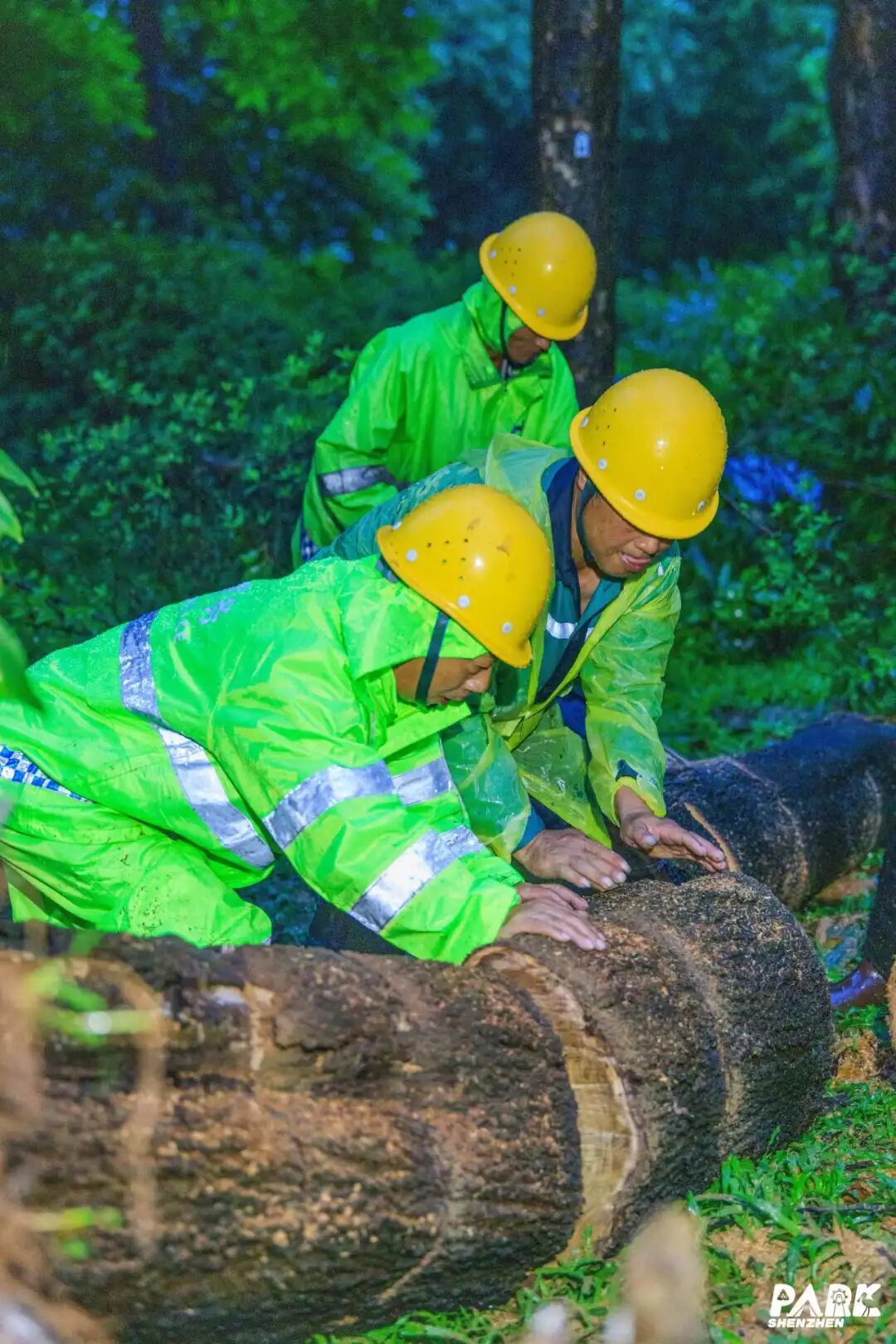 ▲公园人时刻关注台风情况,相守风雨中,处理倒地树木。