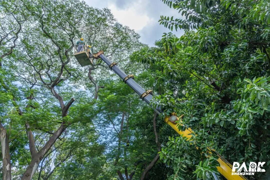 ▲为应对台风“桦加沙”带来的影响,台风前,公园人在高空修剪危枝、加固树木。
