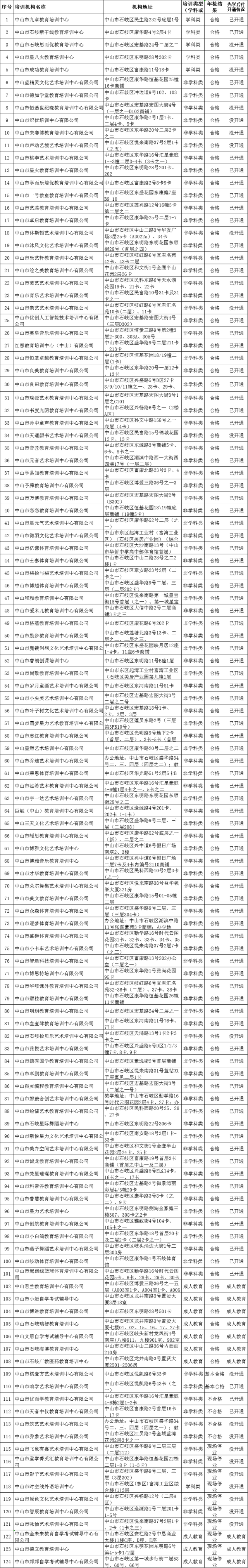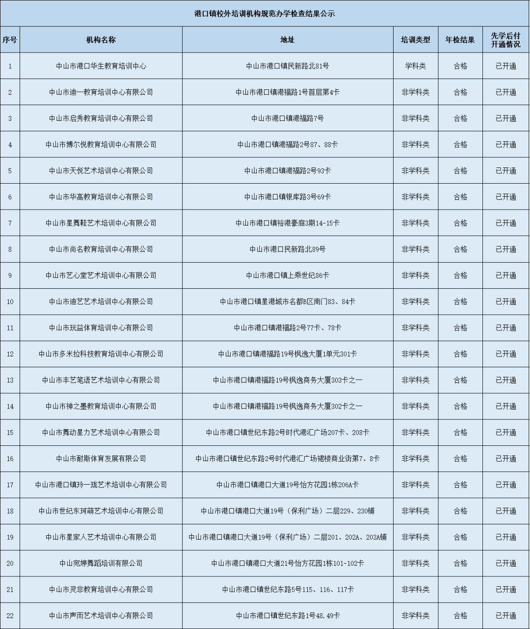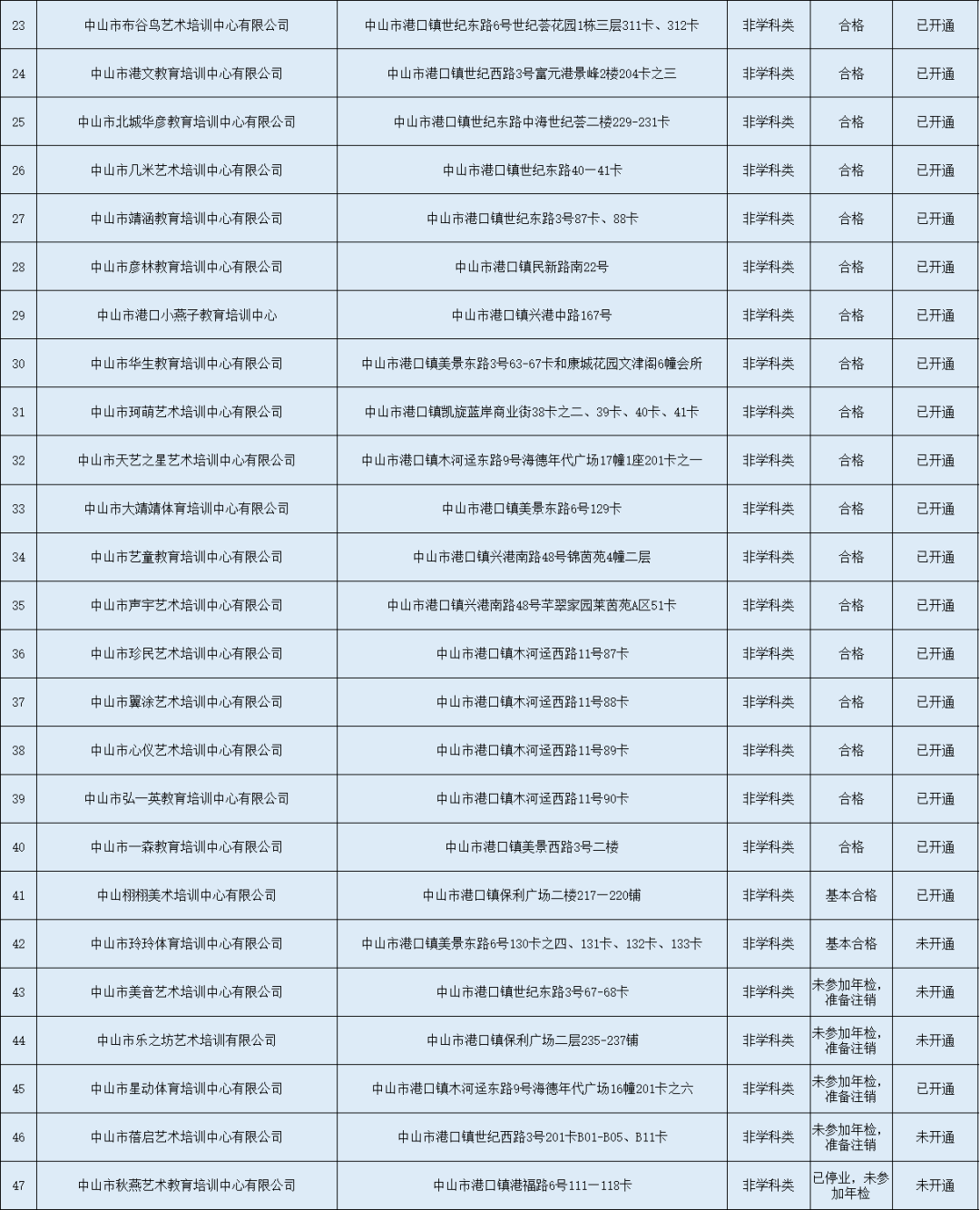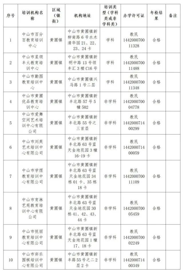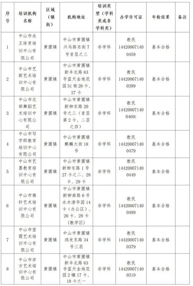 9月24日—25日,中山石岐街道、南区街道、港口镇、黄圃镇先后发布2024年度该镇街校外培训机构年检结果。