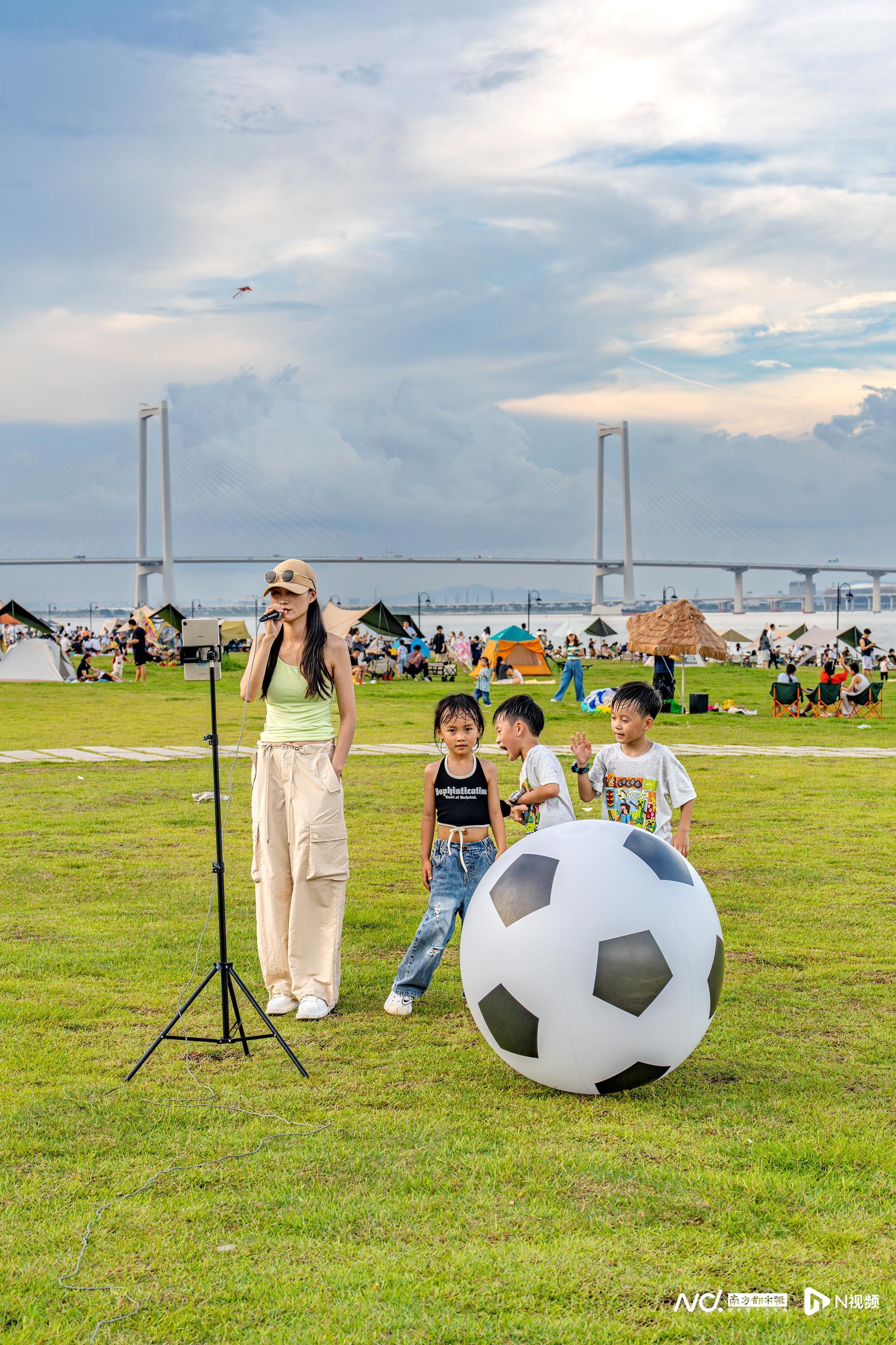 6月29日傍晚,中山马鞍岛,来自深圳的李小姐在草坪上演唱。6月29日傍晚,中山马鞍岛东临路的滨海步道迎来了最迷人的时刻。来自深圳的李小姐在草坪上支起三脚架,海风轻拂她的长发。她一手握着话筒,一手随意地插在裤兜,《千千阕歌》《后来》的旋律随着海风飘向远方。不远处,露营帐篷点缀在如茵绿草间,五彩的风筝在暮色中划出优美的弧线。