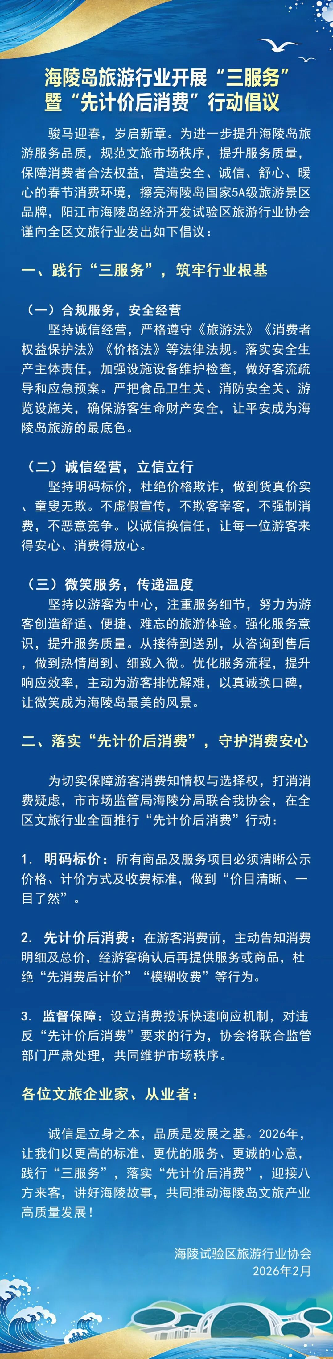 ■温馨提示行前规划,安全为先。密切关注旅游目的地的天气、交通、安全预警等信息,选择正规旅行社和有资质的旅游产品,签订正式旅游合同。不要前往未开发或存在安全隐患的“野景点”以及乘坐“三无”船舶出海游览。来源:海陵试验区旅游行业协会 版权声明:未经许可禁止以任何形式转载 编辑 李婉芬校对 何翠莹 订阅后可查看全文(剩余80%)