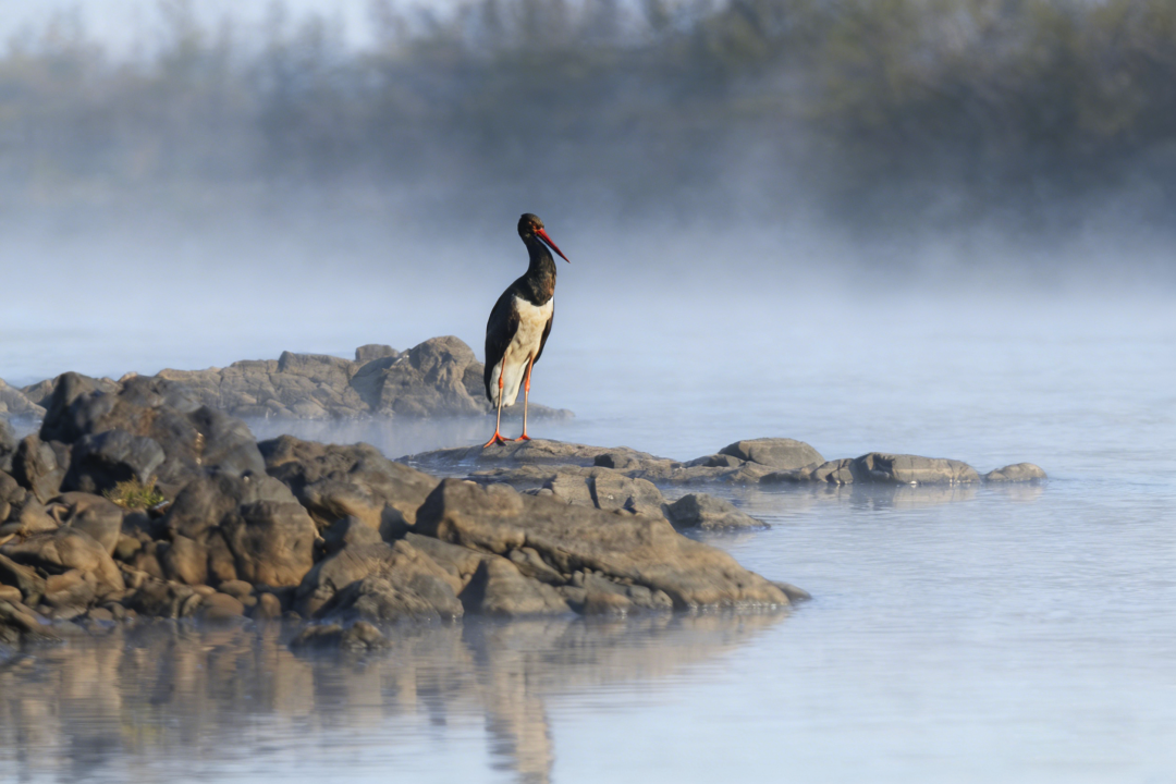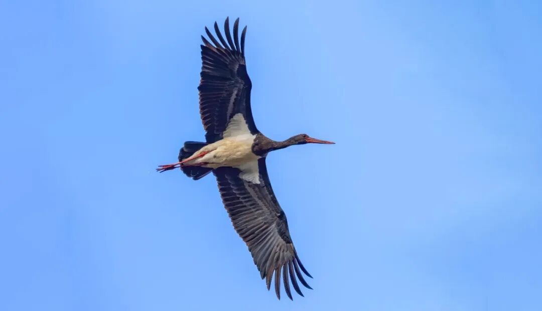 据丹霞山国家公园候选区护鸟监测队石川老师介绍,此次发现的黑鹳隶属于鹳形目鹳科鸟类,该鸟在中国并不常见,是具有“鸟中大熊猫”“鸟中君子”美誉的大型涉禽。中国脊椎动物物种红色名录将其评估其受胁等级为易危(VU),《国家重点保护野生动物名录》将其列为一级保护动物。黑鹳体态高雅,羽色极具辨识度,头颈至背部呈墨黑色并泛有金属绿紫光泽,胸腹部则为纯白色,鲜红的长喙与长腿搭配,在湿地环境中格外醒目。黑鹳偏好栖息于水面宽阔、水质清澈、鱼类资源丰富的库塘沼泽和、河岸浅滩。