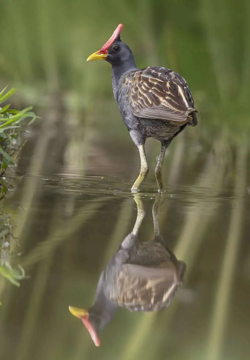 2025年10月11日,石川老师跟踪记录了董鸡在丹霞山的野外活动轨迹。董鸡为鹤形目秧鸡科的中型涉禽,为国家“三有”保护动物(即具有重要生态、科学、社会价值的陆生野生动物)。其物种特征鲜明,雄鸟头顶带有类似鸡冠的红色额甲,后端突起且游离呈尖形,通体灰黑色,下体羽色稍浅;雌鸟体型较小,额甲不突起,上体以灰褐色为主,且非繁殖期雄鸟羽色会与雌鸟趋于一致,给监测识别工作带来了一定挑战。董鸡与黑鹳同为涉禽,与黑鹳栖息宽阔水面不同,它更偏好栖息于芦苇沼泽、灌水稻田、湖边草丛及多水草的沟渠等湿地生境。其活动多集中在晨昏时段,阴天可全天活动,站立姿势挺拔,擅长涉水行走与游泳,平时极少起飞,雄鸟行走时尾羽上翘、头部前后点动的独特姿态极具辨识度。