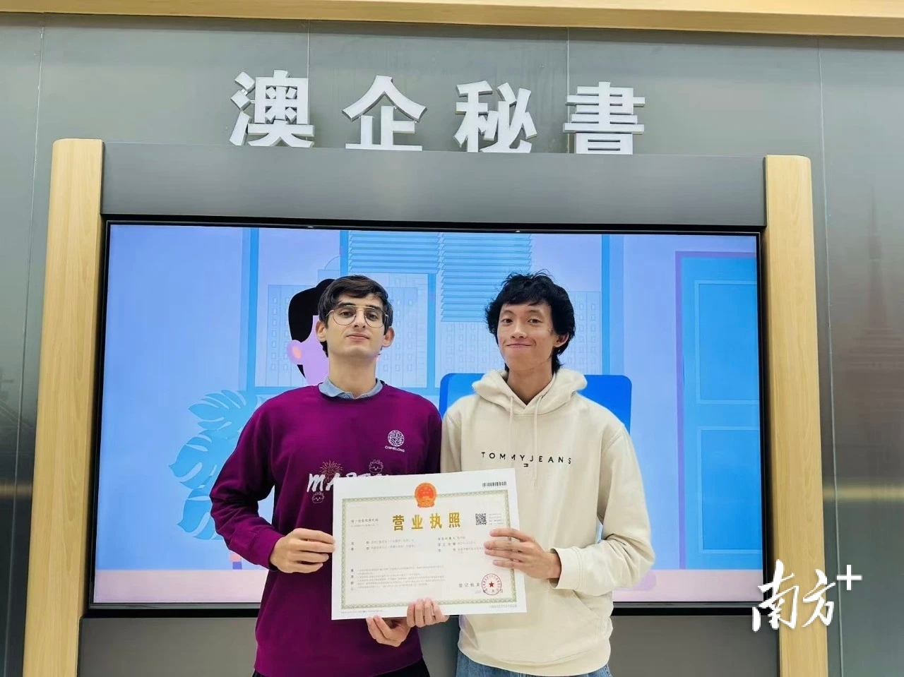 手持刚刚申领的崭新证件,澳门青年陈苇楠与意大利伙伴马丁在横琴粤澳深度合作区政务服务中心的“澳企秘书”专窗前并肩而立,笑容灿烂。
