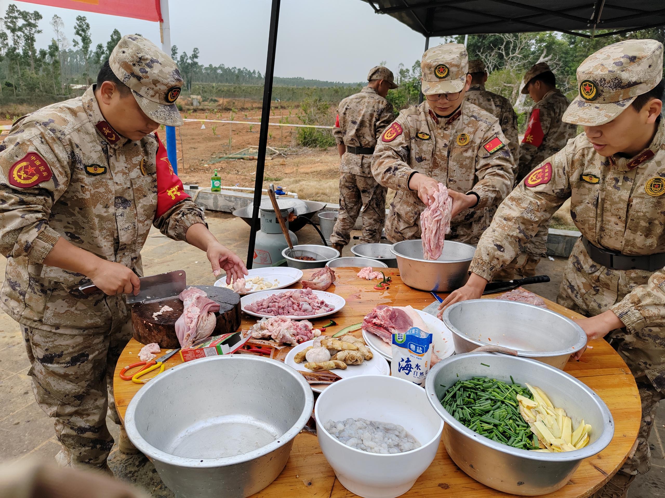 连日来,肇庆民兵支援环北广东工程二期建设正在如火如荼进行中。在施工间隙,肇庆民兵开展了多场共建活动,包括国防教育进校园活动,修整修缮村道、足球场,深入墨坑村走访慰问孤寡老人、特困人员、老党员和退伍老兵。为表示感谢,村民代表们自发给民兵送来一头家养生猪,盛情难却之下,指挥员经过商议,决定用这头猪筹备“孝老宴”,邀请村里的老人和民兵们在工地一线共叙鱼水深情。