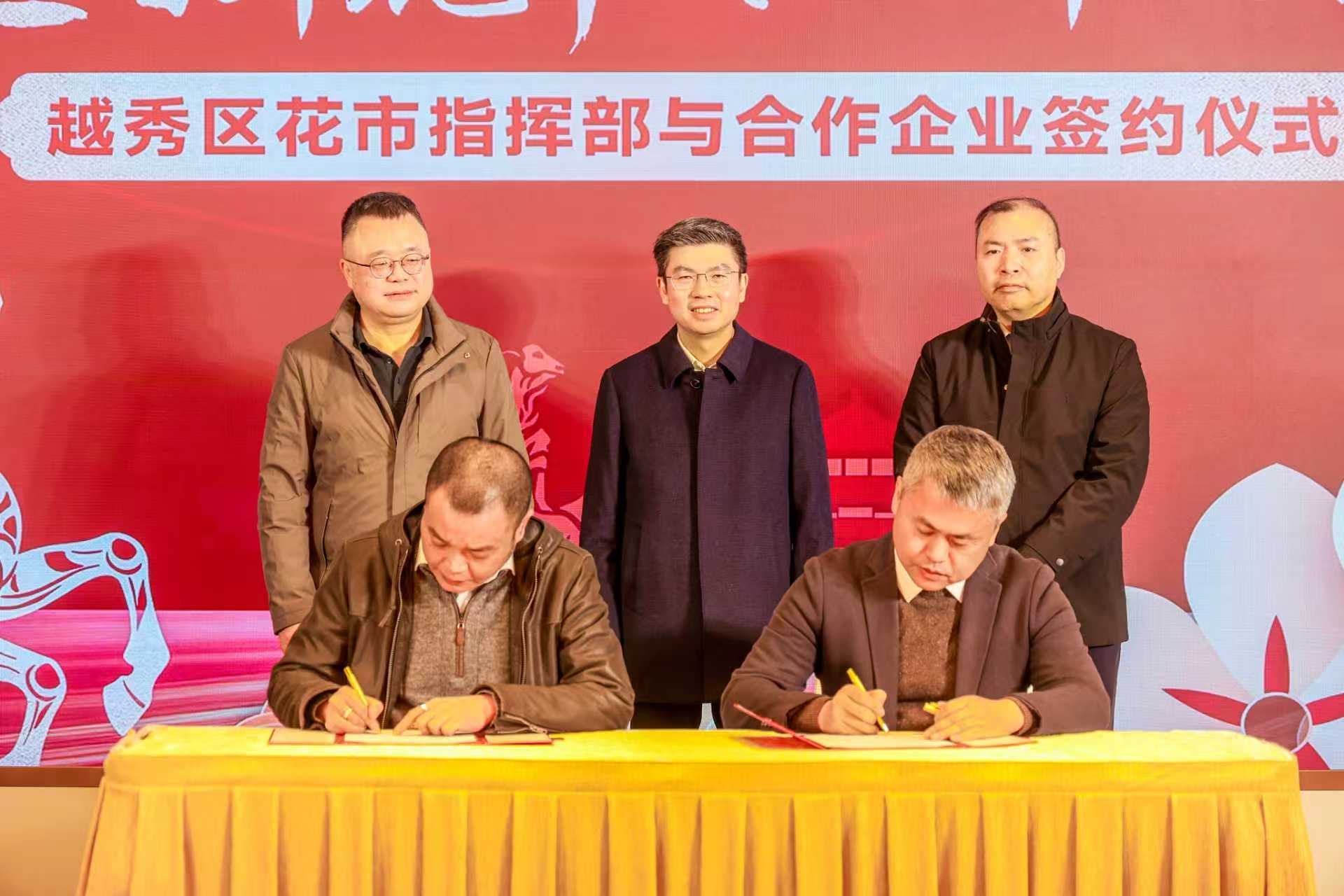 持续发力助推“百千万工程”开创新局面、注入新活力,以“商”助农、以“花”兴农,为优质企业提供展示宣传窗口。今年,西湖花市继续引入对口帮扶地区贵州安顺、广东湛江等地农特产品,新引入福建龙岩连城四堡雕版印刷技艺入驻花市展示推广,打通协作地区农产品产销链条,让优秀非遗文化在更广阔的平台得到传播与弘扬。同时,中国电信、燕塘乳业、招商银行、百威啤酒、宝洁汰渍、工商银行、双鱼体育等知名企业参与花市合作,共绘花市美好蓝图,汇聚发展合力,助力高质量发展。与南越王博物院、中共三大会址纪念馆、广东燕塘乳业、杰森动漫等合作伙伴跨界携手,共同推出IP联名文创产品,通过丰富多元的互动体验,搭建起一个与市民深度对话、共享美好的文化平台。