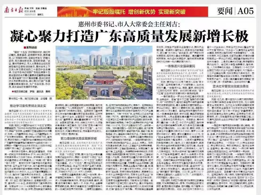 “锚定‘十五五’开好局起好步,我们牢记嘱托、感恩奋进,坚持稳中求进、提质增效,以‘开局即冲刺、全域全年发力’的奋斗姿态,努力增创新优势、实现新突破。”近日,惠州市委书记、市人大常委会主任刘吉接受南方日报专访时表示,惠州全市上下正深入学习贯彻党的二十届四中全会精神、习近平总书记视察广东和出席第十五届全国运动会开幕式重要讲话重要指示精神,落实省委“1310”具体部署,坚决扛起经济大市的责任担当,凝心聚力打造广东高质量发展新增长极,为广东走在前、作示范、挑大梁当好支撑多作贡献。