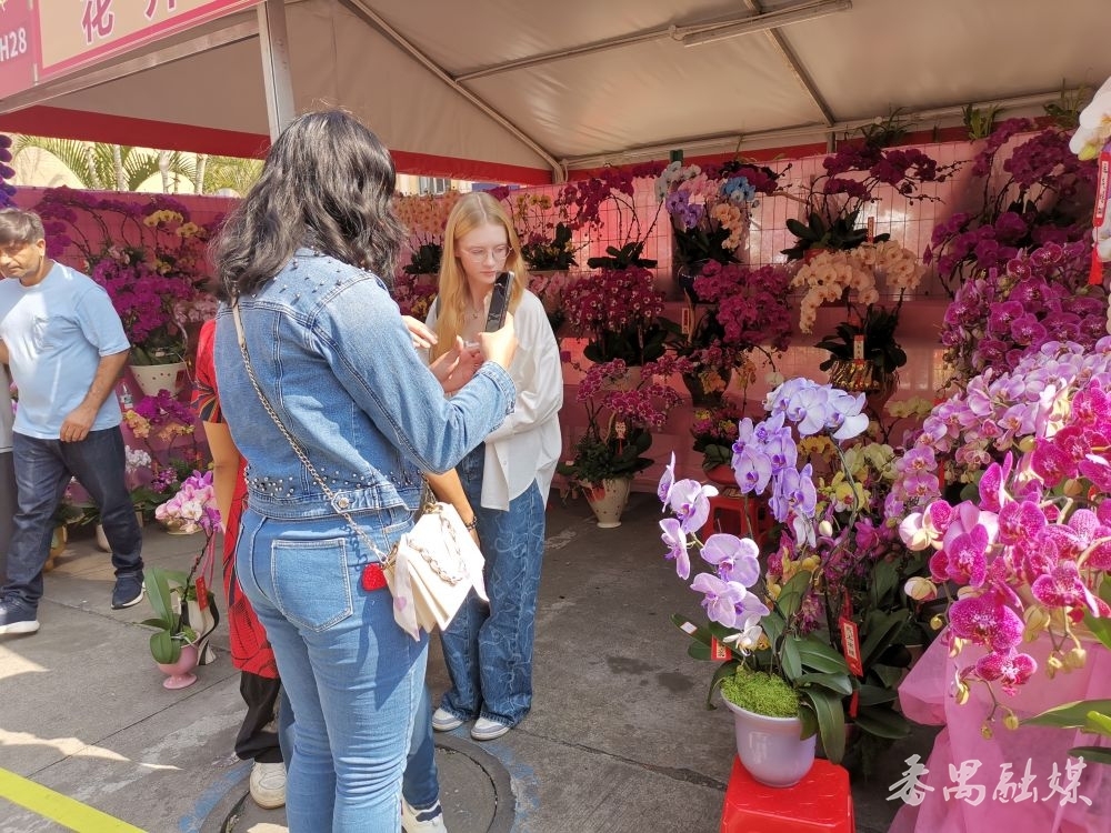 花市现场,蝴蝶兰、大花蕙兰、年桔等各式年花争奇斗艳,市民们穿梭其间挑选心仪年花,处处洋溢着浓浓的新春气息。