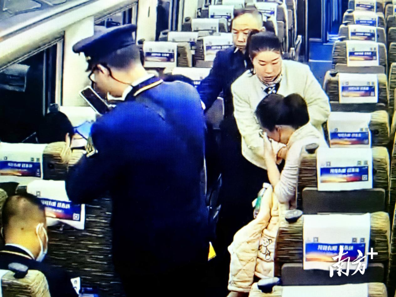 朱小娇(右二)正安抚患儿家属情绪。图源:列车监控