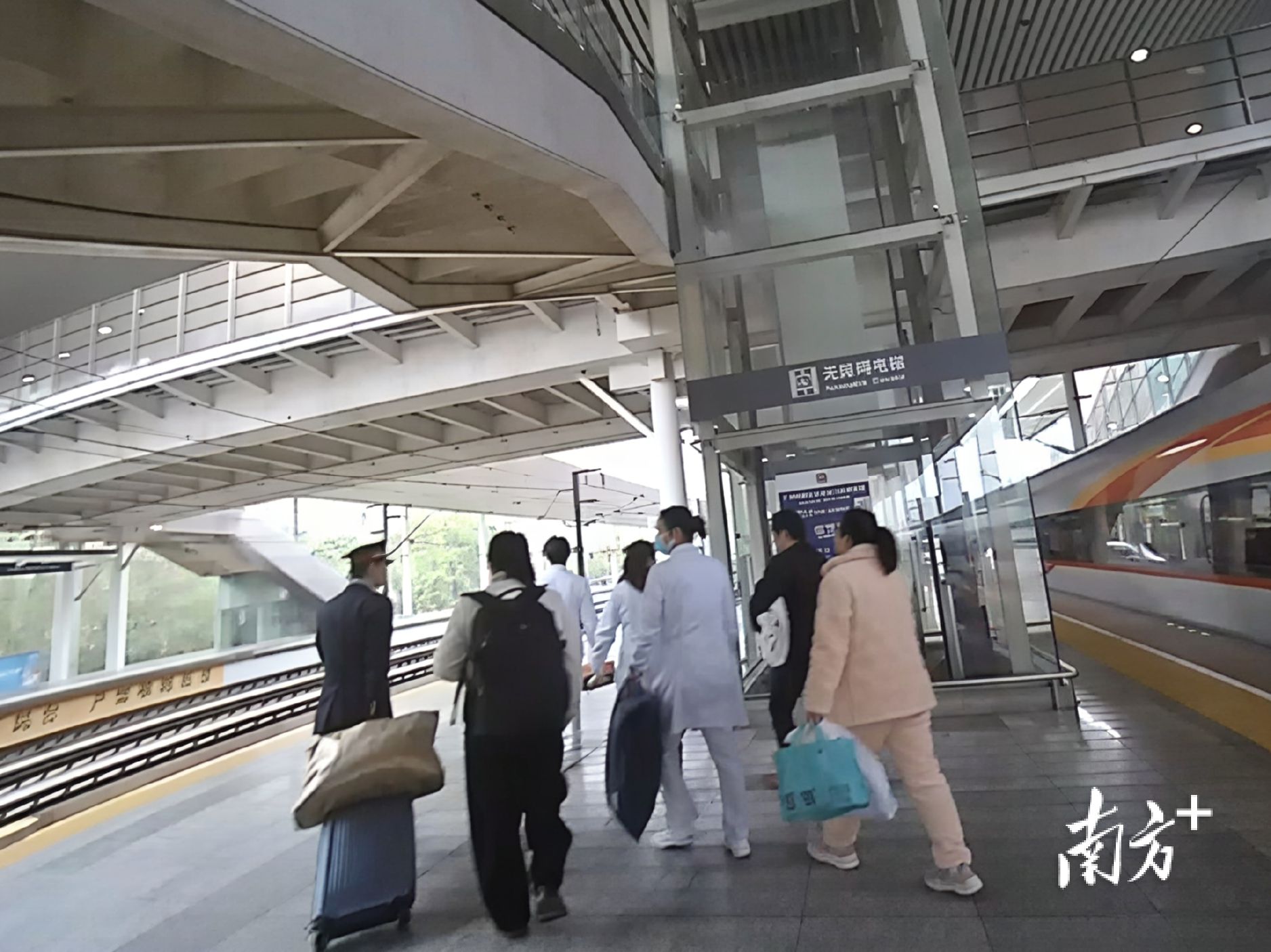 高铁站工作人员及医护们护送患儿和家属出站。