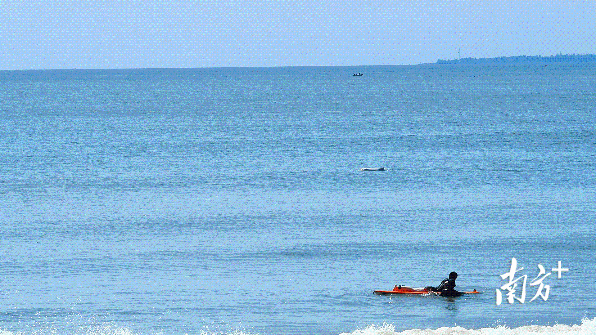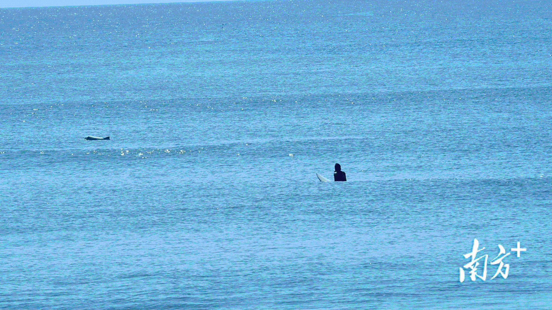 当时,小南正在教练指导下练习冲浪,一声提醒瞬间吸引了所有冲浪爱好者的目光。一大一小两只海豚的身影在碧波间若隐若现,粉白与灰黑的对比在海天之间勾勒出动人的画面。